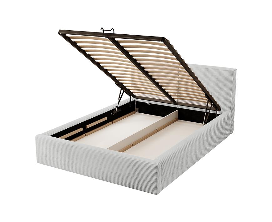 Konstrukcja łóżka opiera się na solidnym stelażu o wymiarach 139x198 cm, który zapewnia optymalne podparcie dla materaca. Łóżko wykonane z laminowanej płyty wiórowej i drewna charakteryzuje się wytrzymałością, jednocześnie prezentując się wyjątkowo estetycznie. Wysokość do siedziska wynosi 35 cm, co pozwala na wygodne wstawanie i kładzenie się. Przemyślane rozwiązania obejmują również przestronny schowek na pościel. Dwa pojemne schowki o wymiarach 69x198 cm z łatwością pomieszczą nie tylko pościel, ale także inne elementy tekstylne, co ułatwia utrzymanie porządku w sypialni. Dzięki gazowemu podnośnikowi dostęp do schowków jest prosty i wygodny, a ich zamknięcie nie wymaga dużego wysiłku.