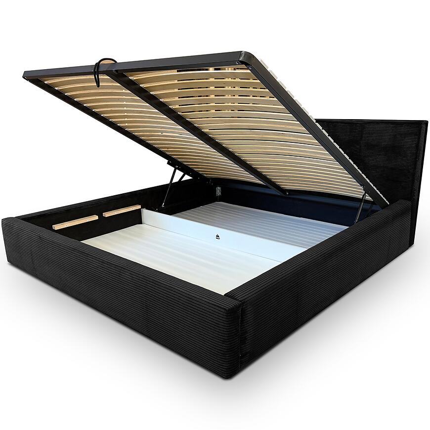 Powierzchnia spania 160x200 cm zapewnia komfortowy sen dla dwóch osób, oferując odpowiednią przestrzeń do wypoczynku. W komplecie znajduje się stelaż 159x198 cm, co ułatwia szybkie przygotowanie łóżka. Pojemnik na pościel z podnośnikiem gazowym pozwala wygodnie przechowywać tekstylia i utrzymać porządek w sypialni.