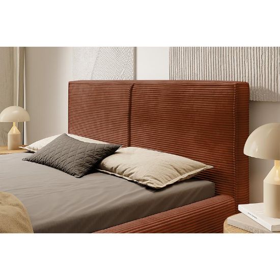Łóżko Inez wykonane jest z solidnej płyty wiórowej laminowanej oraz drewna, co gwarantuje jego trwałość i odporność na codzienne użytkowanie. Tapicerowane tkaniną wezgłowie zostało ozdobione elegancką lamówką, która podkreśla jego nowoczesny wygląd i nadaje sypialni wyjątkowego charakteru. Tył zagłówka wykończono czarną podbitką, co zapewnia estetyczny wygląd łóżka nawet wtedy, gdy nie jest ustawione przy ścianie.