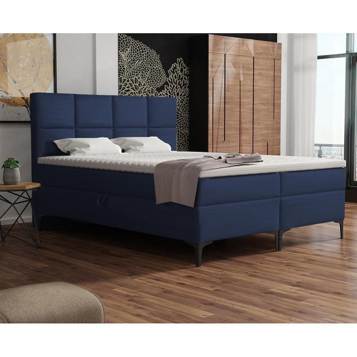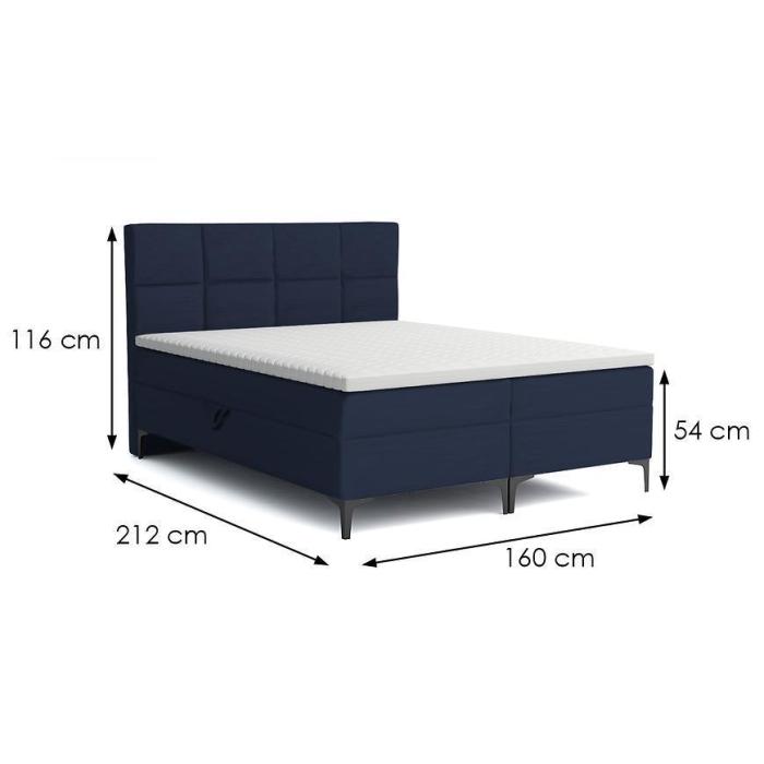 W standardzie łóżka jest średnio twardy materac kieszeniowy. Ozdobne zagłowie tworzy elegancki i współczesny design. Komfortowa powierzchnia spania dla dwóch osób wynosi 160x200 cm. Skrzynie jak i zagłowie wykonane są płyty wiórowej laminowanej obitej tkaniną. Moduł posiada metalowe nóżki w czarnym kolorze.