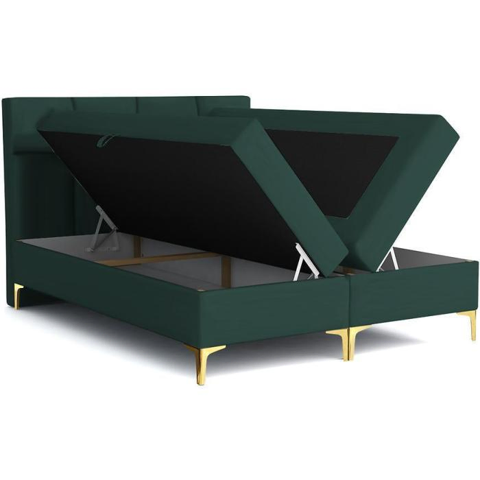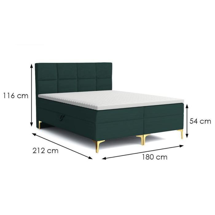 W standardzie łóżka jest średnio twardy materac kieszeniowy. Ozdobne zagłowie tworzy elegancki i współczesny design. Komfortowa powierzchnia spania dla dwóch osób wynosi 180x200 cm. Skrzynie jak i zagłowie wykonane są płyty wiórowej laminowanej obitej tkaniną. Moduł posiada metalowe nóżki w złotym kolorze.
