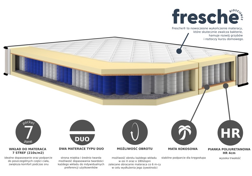 Pokrowiec na materac to coś więcej niż tylko estetyczne wykończenie. Zastosowana w górnej warstwie tkanina Fresche® z certyfikatem OEKO-TEX 100 aktywnie zwalcza bakterie oraz hamuje rozwój grzybów i roztoczy kurzu domowego, co jest szczególnie ważne dla osób cierpiących na alergie. W dolnej części pokrowca wszyty został antyslip, który zapobiega przesuwaniu się materaca, zapewniając stabilność podczas snu. Dzięki tym innowacyjnym rozwiązaniom możesz cieszyć się higienicznym i komfortowym snem każdej nocy.