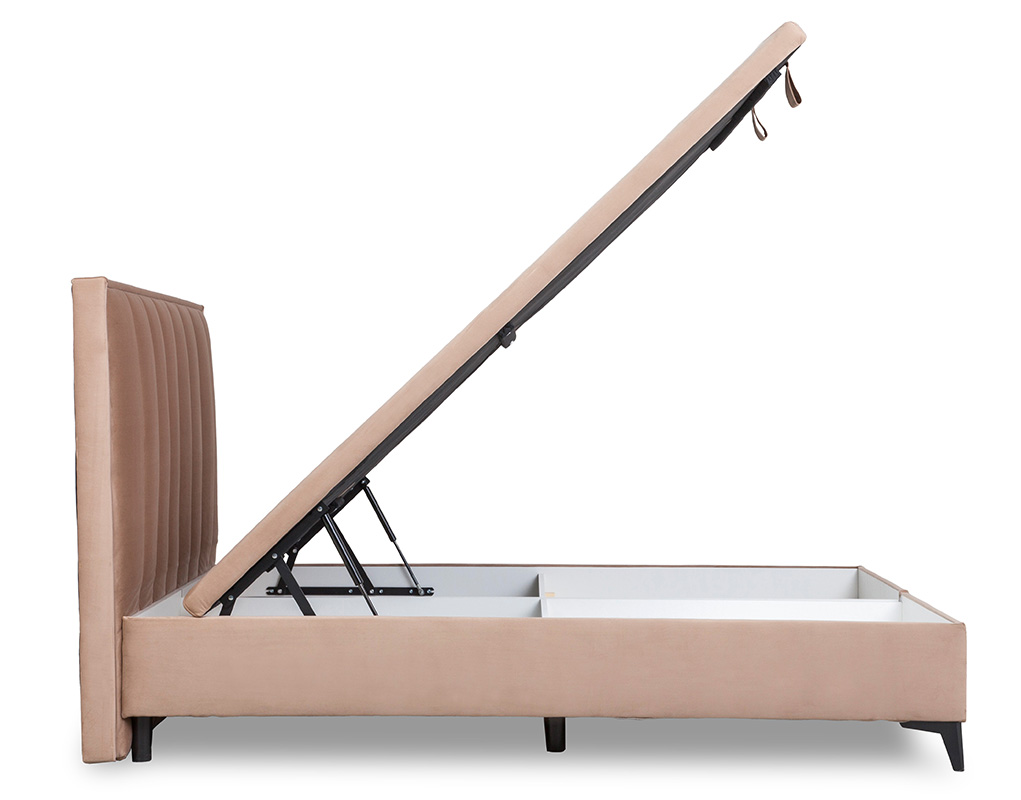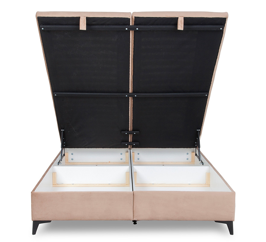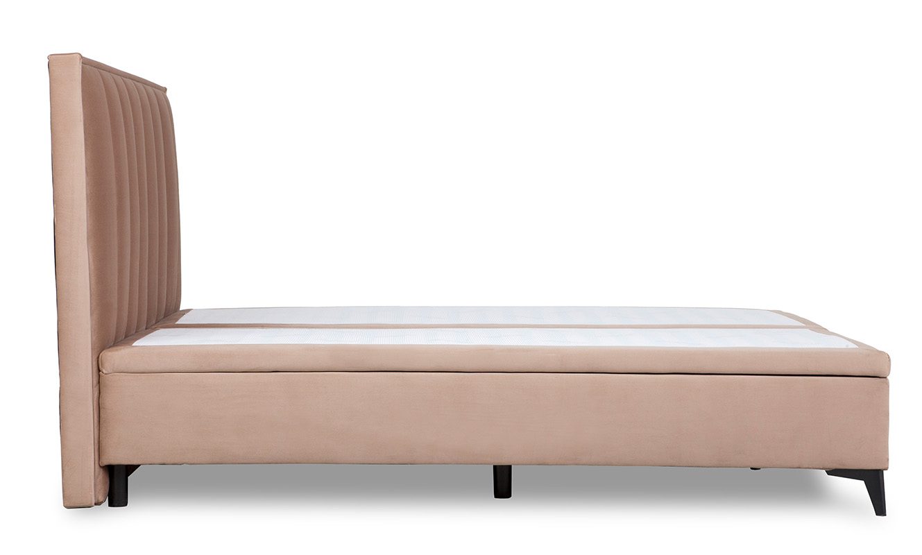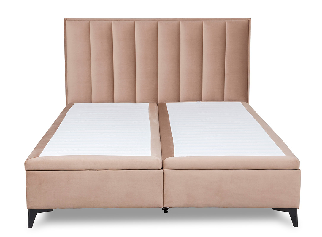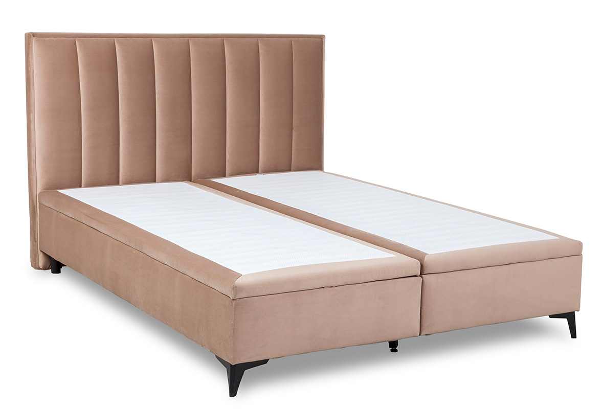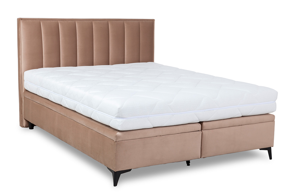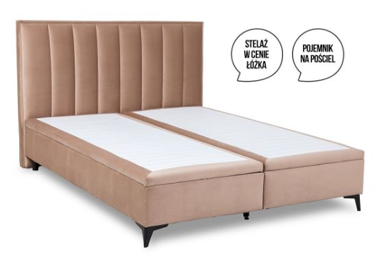 Łóżko tapicerowane Belluno składa się z podwójnej skrzyni oraz eleganckiego zagłówka. Rama łóżka wykonana z giętej sklejki zapewnia dwustopniowe sprężynowanie po położeniu materaca, co zwiększa komfort użytkowania. Łóżko posiada również pojemnik na pościel wyposażony w automat sprężynowy. Rama jest pokryta tkaniną antypoślizgową, co dodatkowo podnosi funkcjonalność i wygodę. Powierzchnia spania wynosi 160x200 cm. Łóżko Belluno jest wykonane w tkaninie Bluvel w kolorze beżowym. Jest to materiał który lekko połyskuje co dodaje mu szlachetności i elegancji. Tkanina charakteryzuje się bardzo dużą wytrzymałość na przetarcia, otarcia oraz rozciąganie. Nóżki w kolorze czarnym, wykonane z materiału HIPS (nóżki ozdobne) lub z PPCO (nóżki ukryte). Jako element dekoracyjny zostały zastosowane na zagłowiu łóżka ozdobne wciągi/przeszycia.