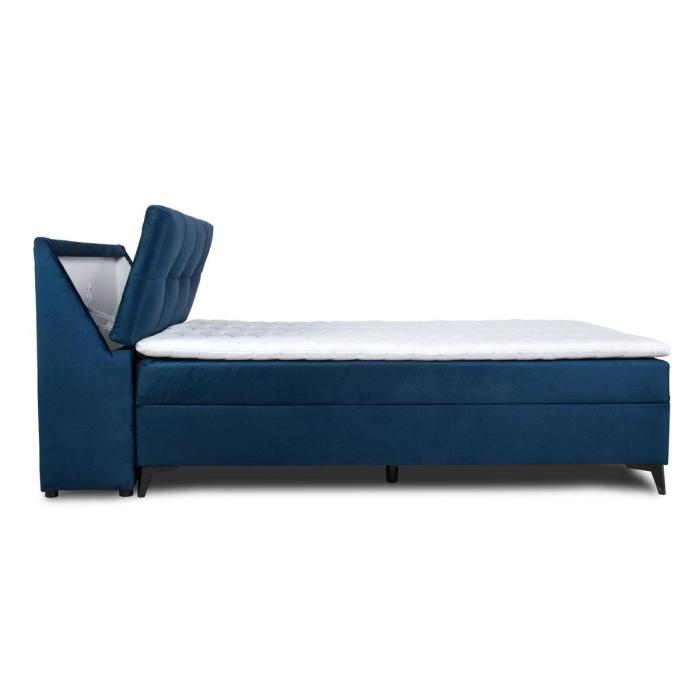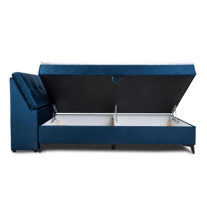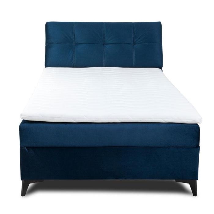 Składa się z pojedynczej skrzyni z siedziskiem z wkładem bonellowym oraz wezgłowia. W komplecie topper z pianki PU T25 o wysokości 4 cm. Pokrowiec można prać w pralce w temperaturze 40 stopni. Łóżko posiada jeden pojemnik na pościel w oskrzyni i dodatkowy pojemnik w wezgłowiu. Powierzchnia spania o wymiarach 120x200cm. Łóżko wyposażono w podnośnik ze sprężyną śrubową. Jako element dekoracyjny zostały zastosowane na zagłowiu łóżka ozdobne wciągi/przeszycia.