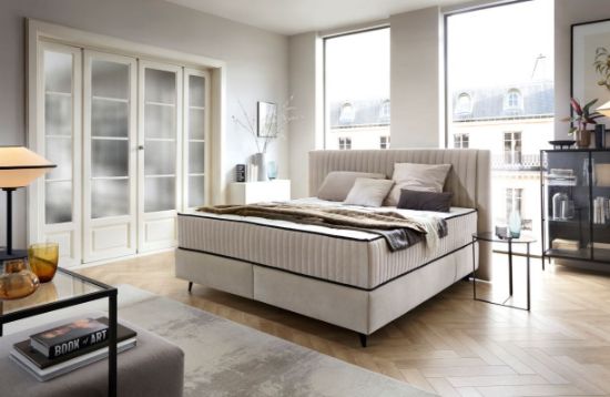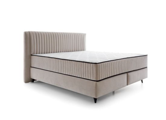 Łóżko Dream jest wykonane w tkaninie Amon w kolorze beżowym. To aksamitna w dotyku tkanina welwetowa, posiada delikatny połysk. Tkanina posiada właściwości water stop - utrudnia wchłaniania rozlanej wody. Jako element dekoracyjny zostały zastosowane na zagłowiu i materacu łóżka ozdobne przeszycia oraz kontrastowa lamówka na materacu. Nóżki są wykonane z tworzywa sztucznego w kolorze czarnym matowym o wysokości 12 cm.