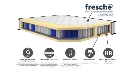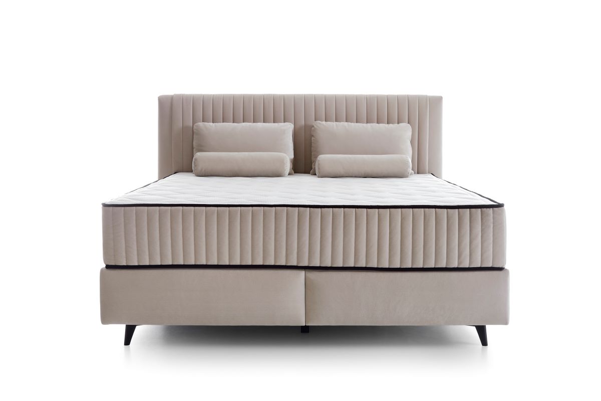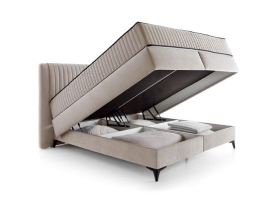 Pokrowiec na materace w dolnej warstwie posiada wszyty antyslip, co zapobiega przesuwaniu materaca podczas użytkowania. W górnej warstwie zastosowano tkaninę antybakteryjną, która zapobiega rozwojowi bakterii, grzybów i roztoczy oraz zapewnia ochronę, komfort i świeżość podczas snu. Łóżko otwierane od czoła (front open) posiada 2 pojemniki na pościel. Model jest wyposażony w siłownik gazowy ułatwiający podnoszenie siedziska. Powierzchnia spania o wymiarach 160/200 cm.