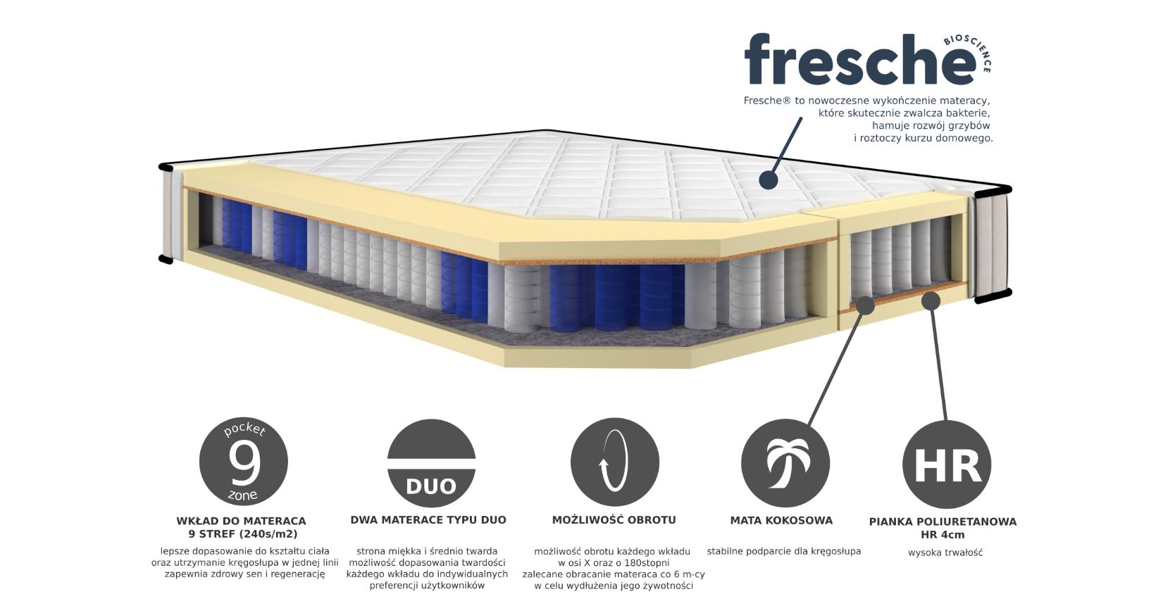 Łóżko kontynentalne Dream posiada dwa osobne materace w jednym pokrowcu, o dwóch różnych stopniach twardości. Jedna strona każdego z materacy jest średnio twarda, a druga strona twarda dzięki zastosowaniu maty kokosowej. Całkowita wysokość materaca wynosi 27 cm. Materac posiada wkład sprężynowy typ "pocket 9 stref" zapewniajac lepsze ułozenie kręgoslupa, umozliwiając jego regenerację. Twrdośc materaca jest określana jako średni/średniotwardy. Materace można obrócić niezależnie o 180 stopni wewnątrz pokrowca w celu dostosowania twardości. Zaleca się systematycze odwracanie materaca aby wydłużyc jego żywotność.