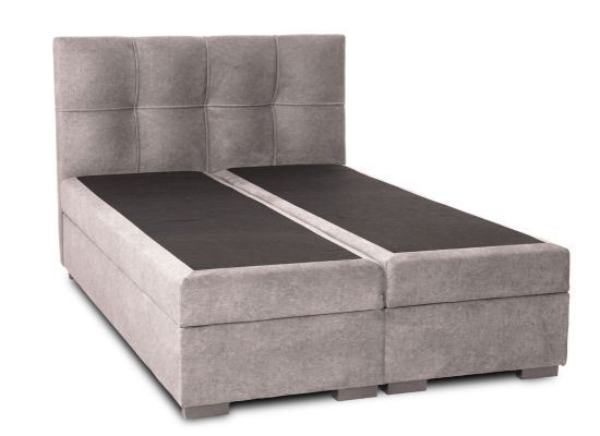 Łóżko składa się z dwóch skrzyń oraz eleganckiego zagłowia, które wykonane zostały z połączenia płyty laminowanej oraz drewna, co zapewnia trwałość i stabilność. Ozdobne wciągi i przeszycia na zagłówku dodają całości wyjątkowego charakteru, czyniąc je nie tylko miejscem do spania, ale także stylowym elementem wystroju sypialni.