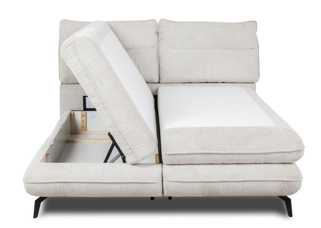 W konstrukcji łóżka znajdują się dwa pojemniki na pościel, umieszczone po obu stronach ramy. Otwieranie boczne zapewnia swobodny dostęp do wnętrza, co ułatwia organizację sypialni. W pojemnikach można przechowywać kołdry, poduszki, koce lub sezonową odzież, jednocześnie nie tracąc przestrzeni w innych meblach. Dzięki temu Harmony 160x200 staje się nie tylko komfortowym miejscem do spania, ale także praktycznym elementem wyposażenia.
