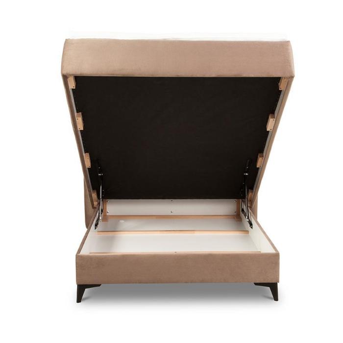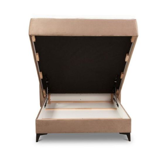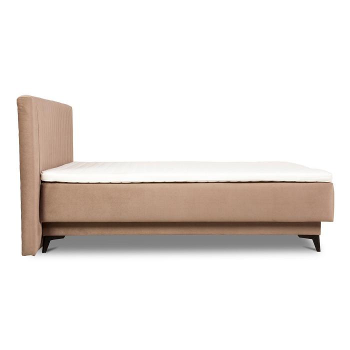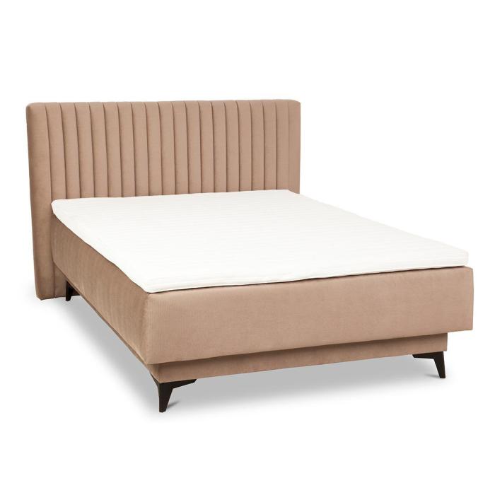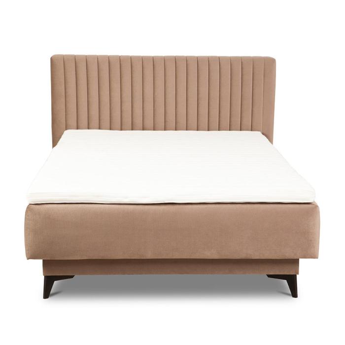 Łóżko kontynentalne Kalla składa się z jednej skrzyni oraz wezgłowia. W komplecie materac kieszeniowy 7 stref twardości + topper z pianki wysokoelastycznej HR 3032 Premium. Wysokość toppera to 4 cm, pokrowiec można prać w pralce w temperaturze 40 stopni. Łóżko posiada pojemnik na pościel. Powierzchnia spania o wymiarach 140x200 cm. Łóżko posiada siłownik gazowy, który ułatwia rozkładanie. Jako element dekoracyjny zostały zastosowane na zagłowiu łóżka ozdobne przeszycia. Nóżki wykonane z tworzywa sztucznego o wysokości 12 cm.