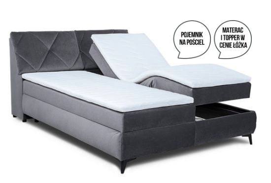 Łóżko kontynentalne Mix Moris składa się skrzyni motorowej po prawej stronie, skrzyni pościelowej po lewej stronie, wezgłowia z dodatkową funkcją pojemników, materaca w siedzisku oraz dwóch topperów. Skrzynia motorowa posiada siedzisko z wkładem kieszeniowym natomiast skrzynia pościelowa z wkładem bonellowym. Pojemniki na pościel znajdują się w skrzyni pościelowej oraz w wezgłowiu. Łóżko nie posiada pojemnika na pościel pod skrzynią motorową. Topery wykonane z pianki PU T25 o wysokości 4 cm. Pokrowiec można prać w pralce w temperaturze 40 stopni. Powierzchnia spania o wymiarach 160x200cm. Jako element dekoracyjny zostały zastosowane na zagłowiu łóżka ozdobne wciągi/przeszycia.
