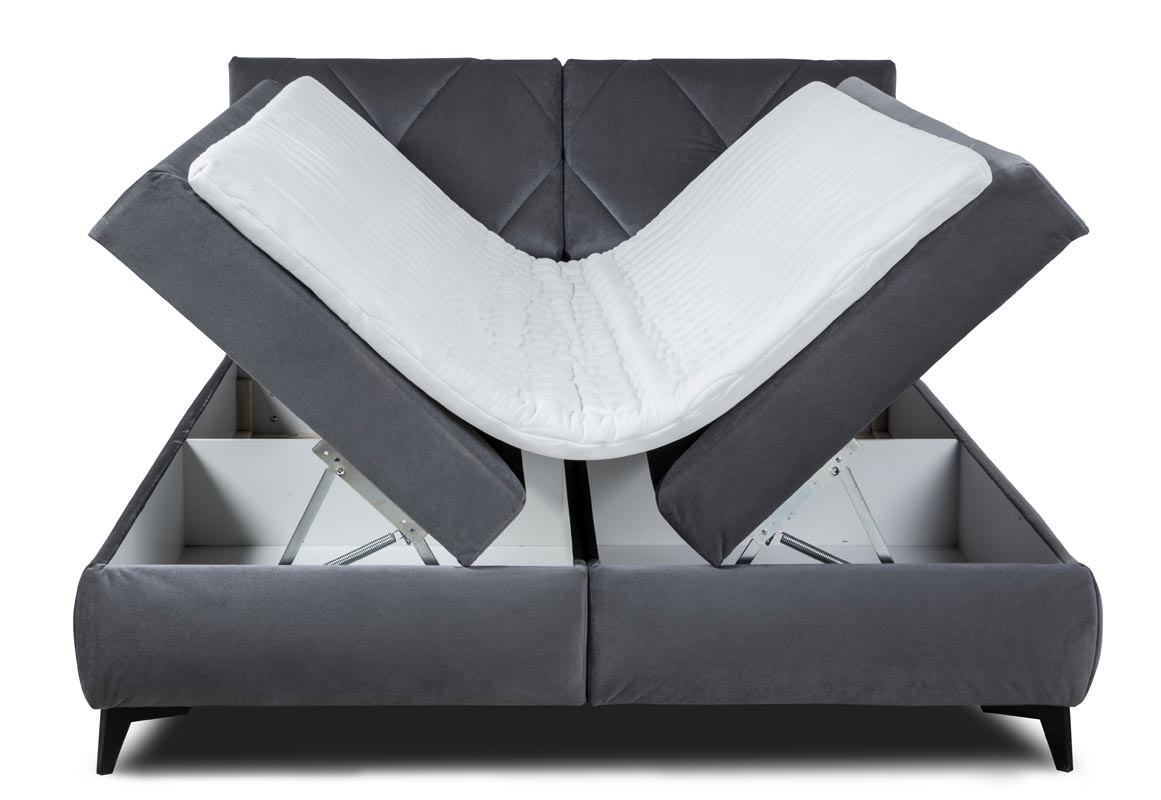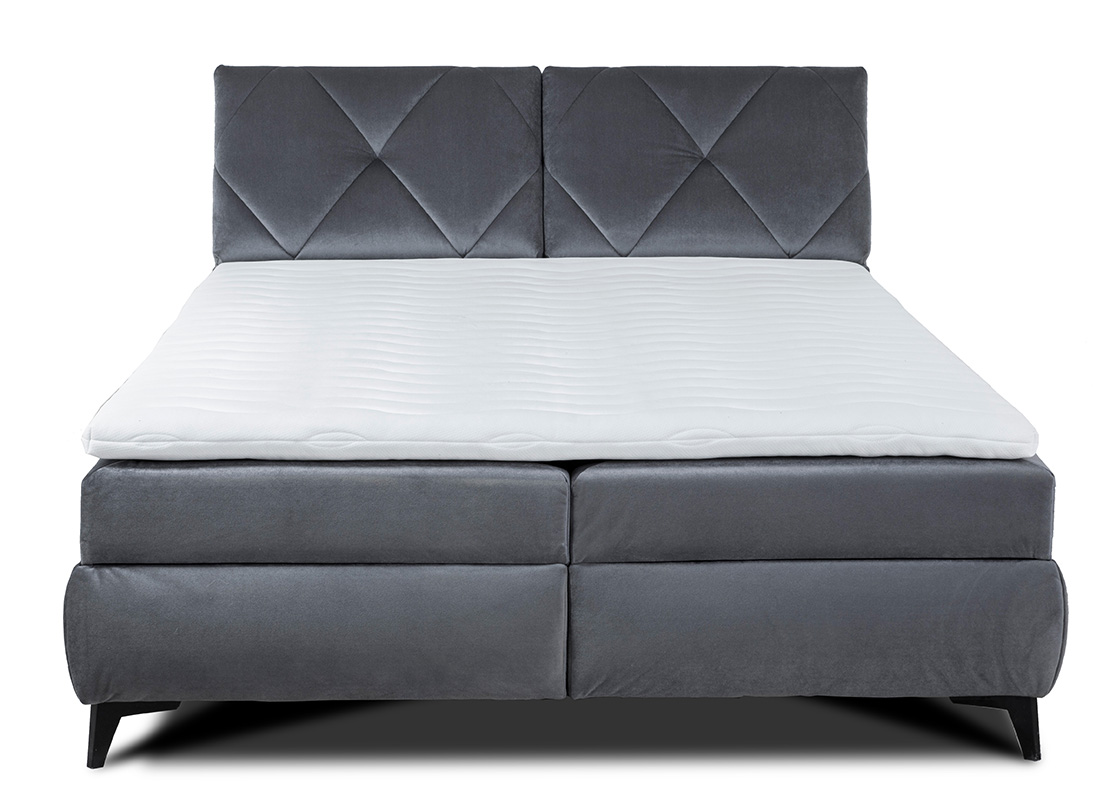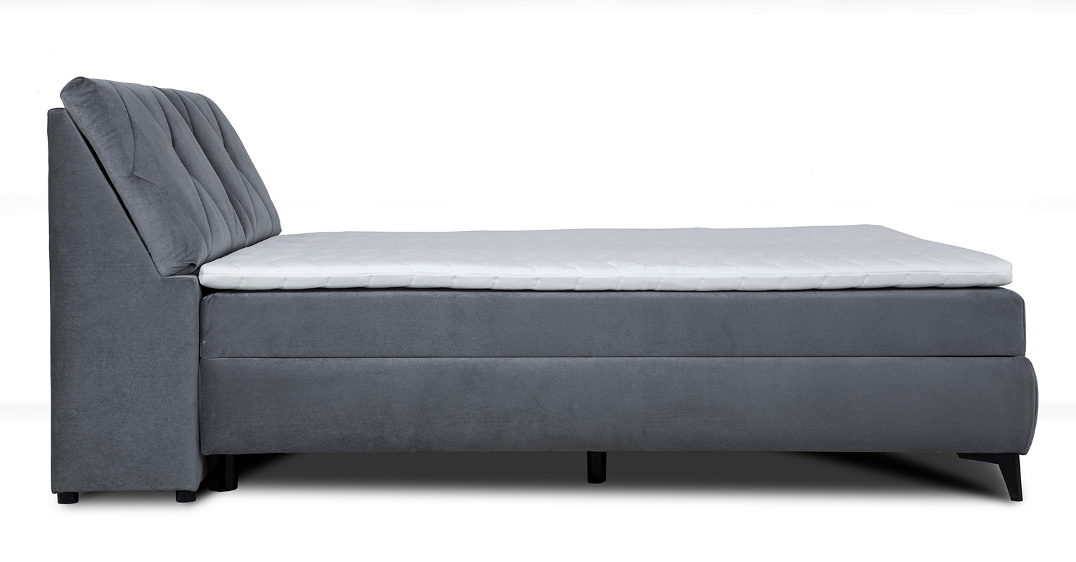 Łóżko kontynentalne Moris składa się skrzyni pościelowej po prawej oraz lewej stronie, wezgłowia z dodatkową funkcją pojemników, materaca w siedzisku oraz toppera. Skrzynie posiadają siedziska z wkładem bonellowym. Toper wykonany z pianki PU T25 o wysokości 4 cm. Pokrowiec można prać w pralce w temperaturze 40 stopni. Powierzchnia spania o wymiarach 160x200cm. Jako element dekoracyjny zostały zastosowane na zagłowiu łóżka ozdobne wciągi/przeszycia.