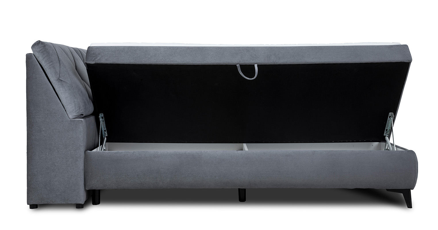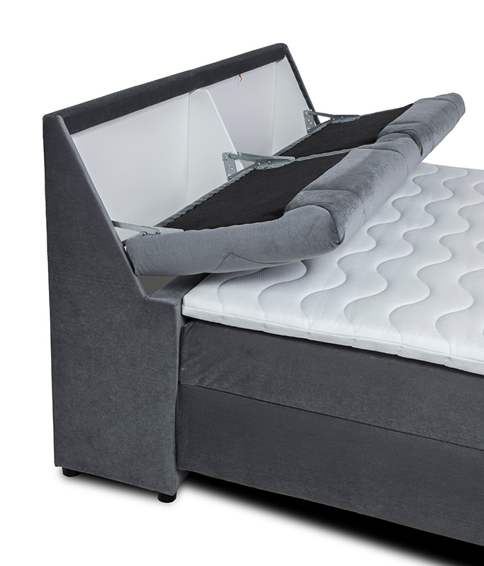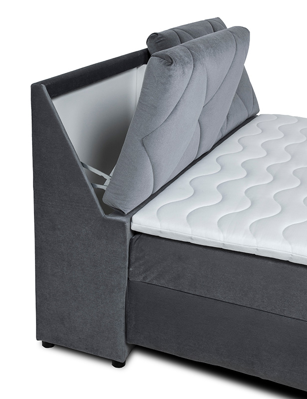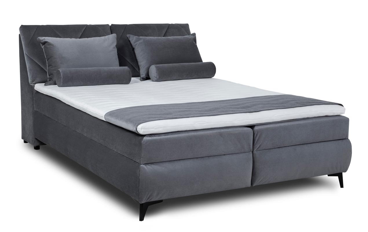 Łóżko kontynentalne Moris składa się skrzyni pościelowej po prawej oraz lewej stronie, wezgłowia z dodatkową funkcją pojemników, materaca w siedzisku oraz toppera. Skrzynie posiadają siedziska z wkładem bonellowym. Toper wykonany z pianki PU T25 o wysokości 4 cm. Pokrowiec można prać w pralce w temperaturze 40 stopni. Powierzchnia spania o wymiarach 160x200cm. Jako element dekoracyjny zostały zastosowane na zagłowiu łóżka ozdobne wciągi/przeszycia.