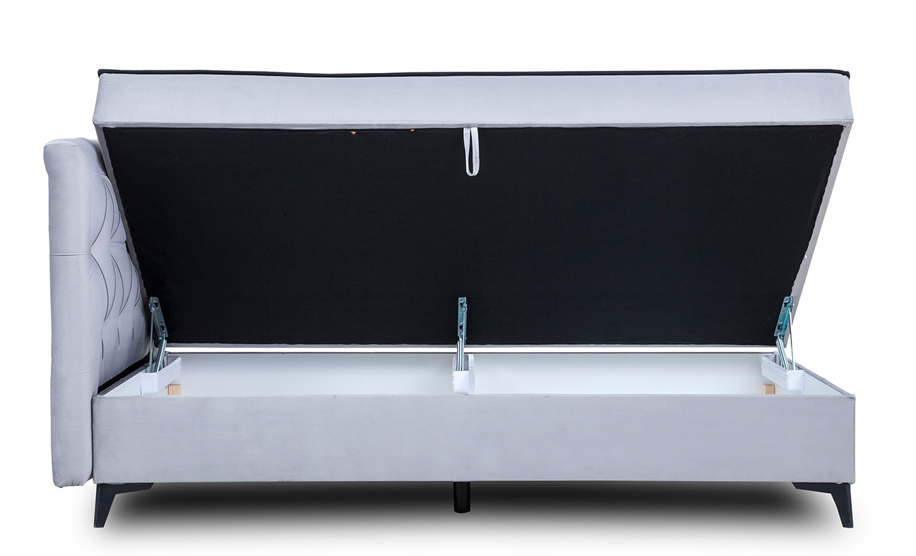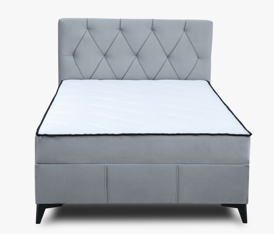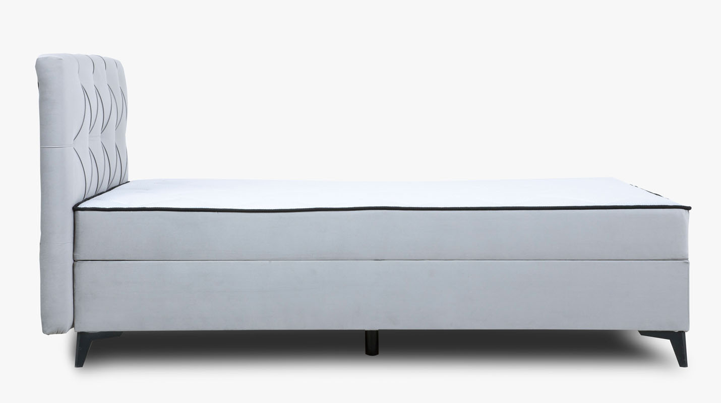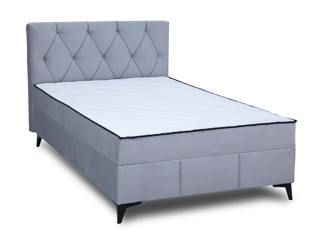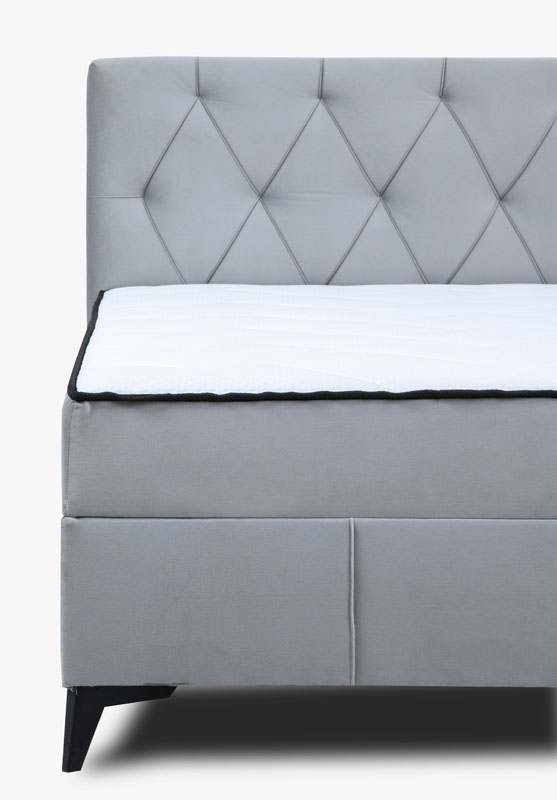 Łóżko kontynentalne Mossa składa się z pojedynczej skrzyni oraz stylowego wezgłowia. Wyposażone jest w pojemnik na pościel z automatem sprężynowym, co ułatwia jego otwieranie. Materac trwale połączony z konstrukcją łóżka posiada wkład ze sprężyn o grubości druta 2,4mm oraz pianki PU 4 cm. Siedzisko zintegrowane z topem powoduje brak zsuwania się topa z łóżka. Box wykończony jest tkaniną antybakteryjną Fresh, co zwiększa komfort i funkcjonalność mebla. Siedzisko ma wszyty rajtex antypoślizgowy co dodatkowo podnosi funkcjonalnośc i wygodę. Powierzchnia spania o wymiarach 120x200 cm. Łóżko Mossa jest wykonane w tkaninie Velluto, materiał lekko połyskuje co dodaje mu szlachetności i elegancji. Tkanina charakteryzuje się bardzo dużą wytrzymałość na przetarcia, otarcia oraz rozciąganie. Nóżki w kolorze czarnym, wykonane z materialu HIPS (nóżki ozdobne) oraz z PPCO (nóżki ukryte). Jako element dekoracyjny zostały zastosowane na zagłowiu łóżka ozdobne pikowania/przeszycia.