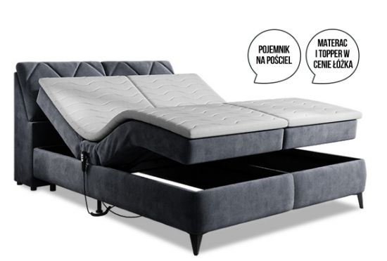 Łóżko kontynentalne, motorowe Moris składa się skrzyni motorowej po prawej oraz lewej stronie, wezgłowia z dodatkową funkcją pojemników, materaca w siedzisku oraz toppera. Skrzynie motorowe posiadają siedziska z wkładem kieszeniowym. Łóżko nie posiada pojemników na pościel pod skrzyniami motorowymi, pojemniki znajdują się w wezgłowiu. Toper wykonany z pianki PU T25 o wysokości 4 cm. Pokrowiec można prać w pralce w temperaturze 40 stopni. Powierzchnia spania o wymiarach 160x200cm. Jako element dekoracyjny zostały zastosowane na zagłowiu łóżka ozdobne wciągi/przeszycia.