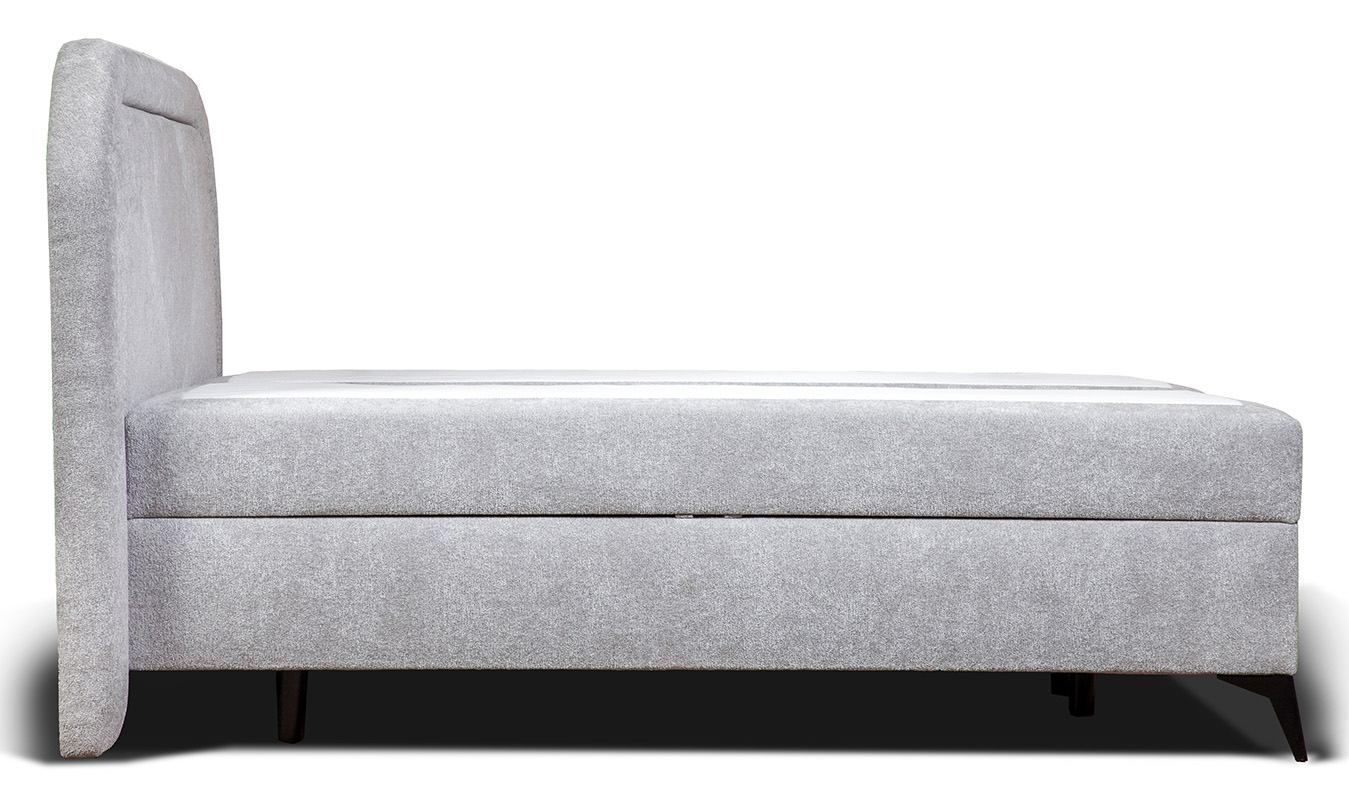 Cała konstrukcja łóżka została obita wytrzymałą tkaniną Toro w modnym, szarym odcieniu. Materiał charakteryzuje się dużą odpornością na ścieranie oraz łatwością w pielęgnacji, co sprawia, że łóżko będzie prezentowało się estetycznie przez długie lata. Elegancki wygląd całości podkreślają wysokie, czarne nóżki metalowe, nadające bryle lekkości i nowoczesnego charakteru.