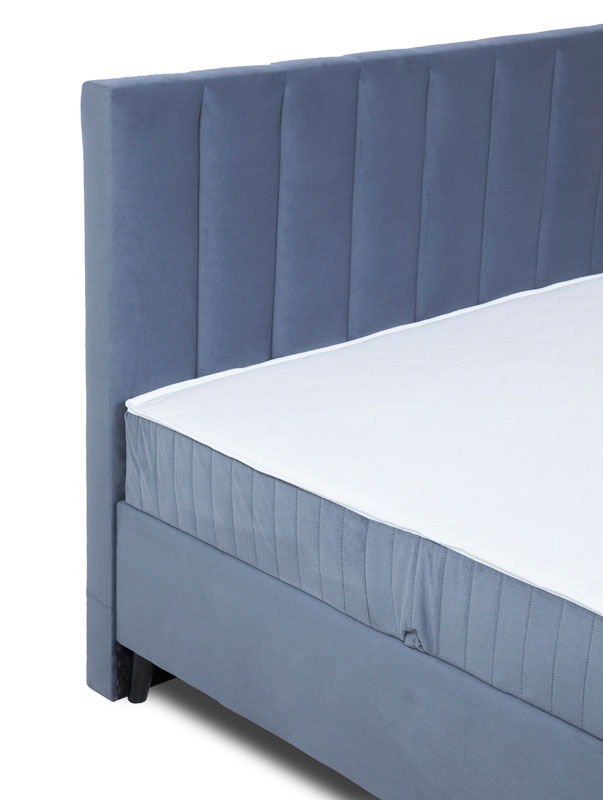 Boki materaca zostały starannie wykonane z pikowanej tkaniny, co nadaje im nie tylko estetyczny wygląd, ale również zwiększa trwałość produktu. Powierzchnia spania, pokryta bawełnianą tkaniną materacową, została pikowana, a jej górną część ozdobiono delikatną białą lamówką, nadając całemu łóżku subtelny urok.