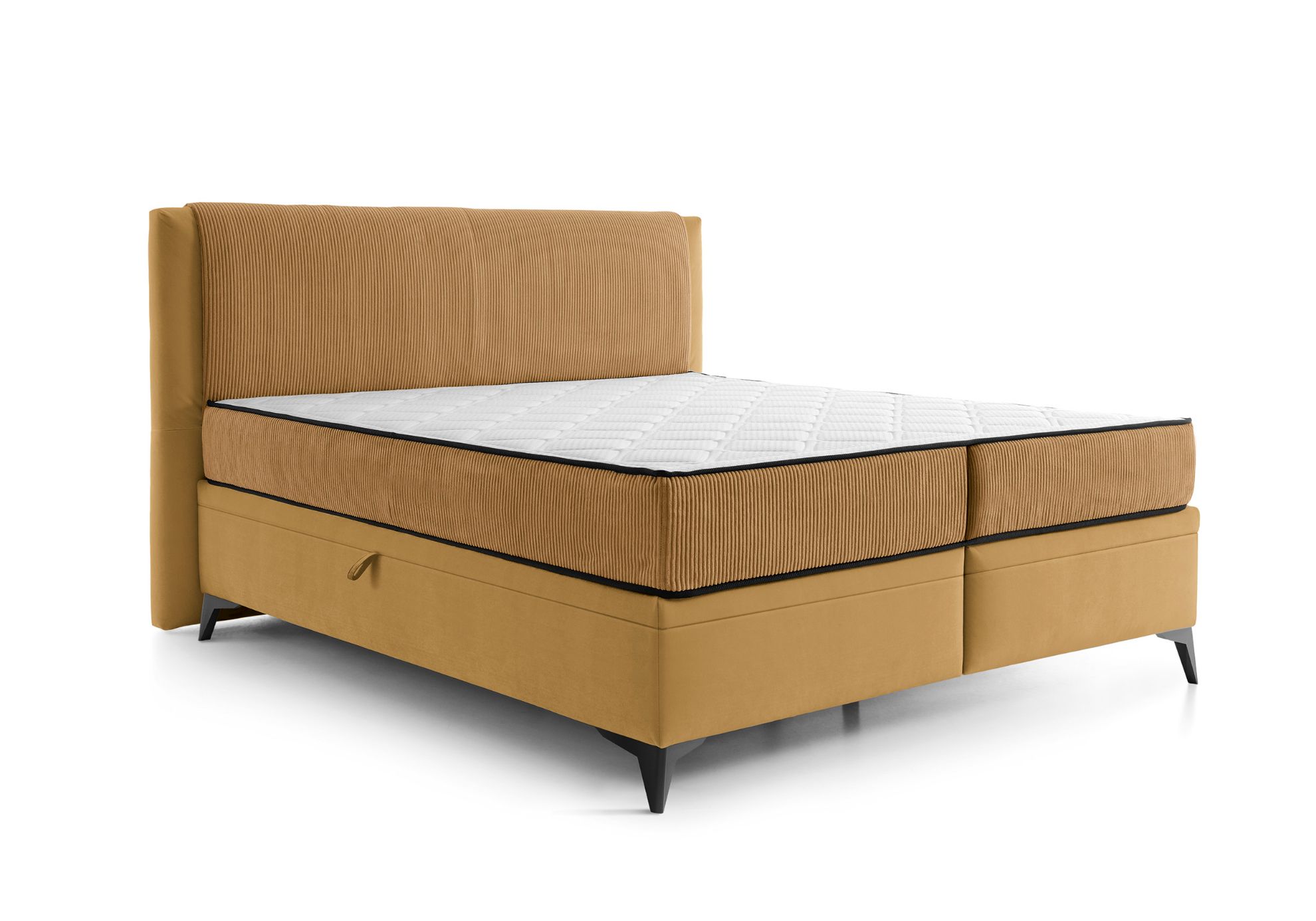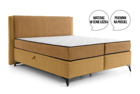 Stylowe wykonanie łóżka to kolejny atut tego produktu. Powierzchnia spania o wymiarach 160x200 cm. Łóżko Selva jest tapicerowane tkaniną Kronos, która doskonale komponuje się z koordynatem w tkaninie Poso, nadając całości elegancki i nowoczesny charakter. Kolor musztardowy nadaje wnętrzu łóżka subtelnego, ale jednocześnie śmiałego akcentu.