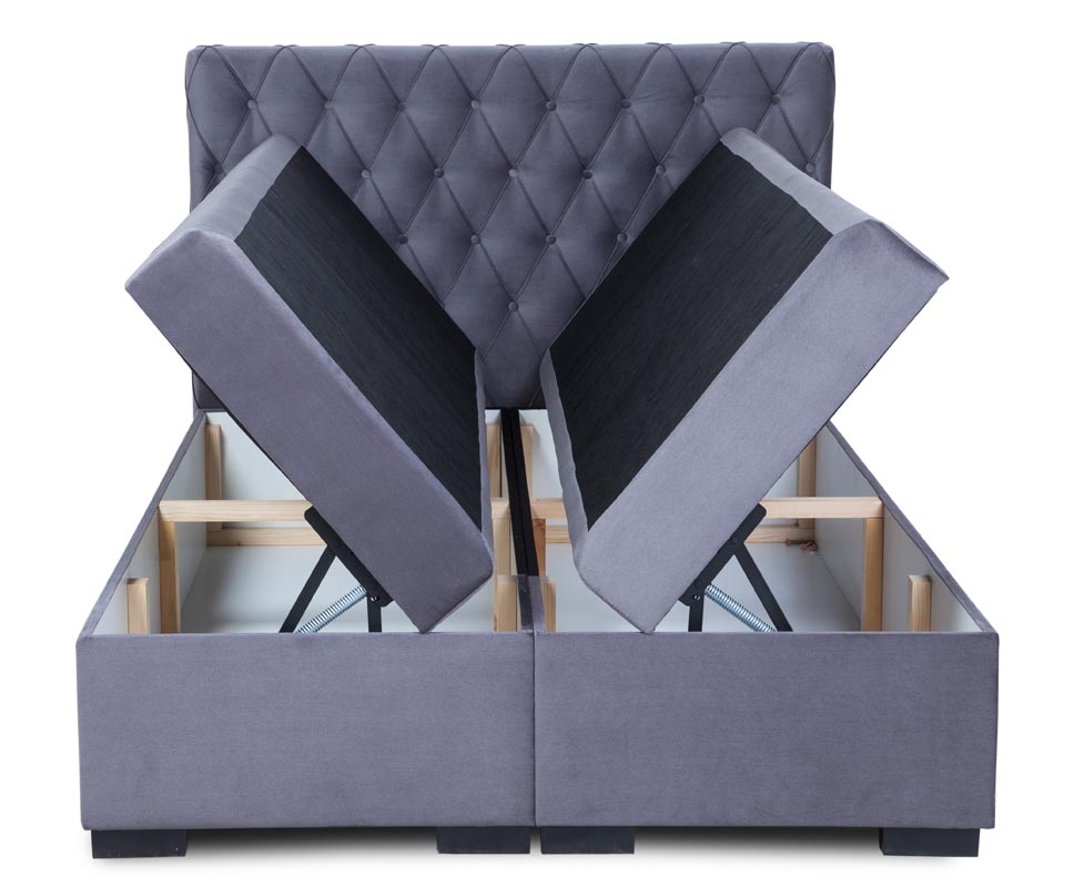 Pomyślano o praktycznych aspektach użytkowania tego łóżka. Dwa pojemniki na pościel z automatem wspomagającym rozkładanie ułatwiają przechowywanie dodatkowego kompleta pościeli czy koców. Automatyczny mechanizm sprawia, że otwieranie i zamykanie pojemników jest łatwe i wygodne. To doskonałe rozwiązanie dla osób ceniących funkcjonalność i porządek w sypialni.