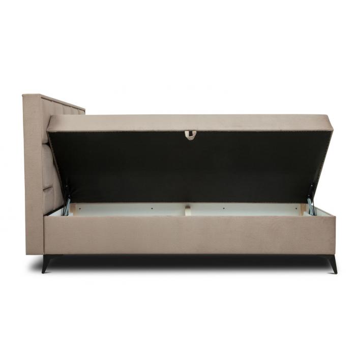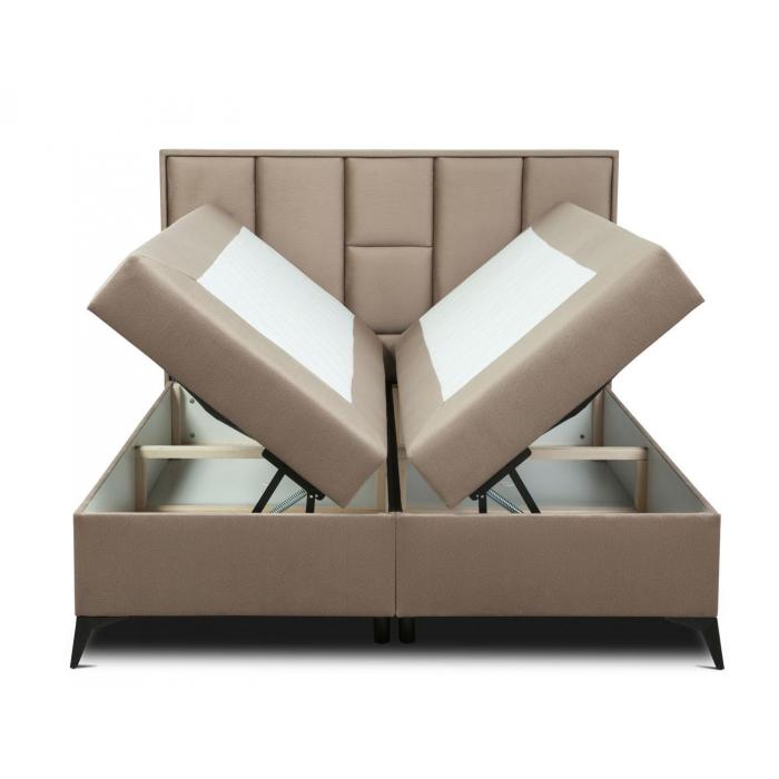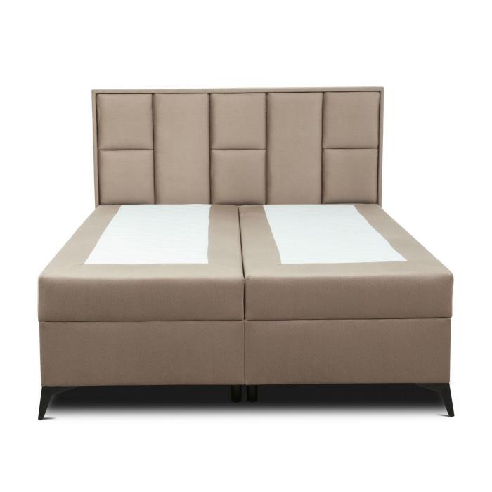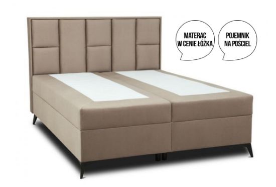 Łóżko kontynentalne Zoya bez toppera. Łóżko składa się z dwóch niezależnych skrzyni i wezgłowia. Posiada boczne otwieranie pojemników ze wspomaganiem. W komplecie materace kieszeniowe pocket o 7 strefach twardości. Skrzynia i zagłowie tapicerowane są tkaniną Element w kolorze beżowym - jest to tkanina hydrofobowa. Na środkowej części materaca zastosowano tkaninę Silver z jonami srebra stosowaną do produkcji materacy antyalergicznych. Jako element dekoracyjny na wezgłowiu zastosowano ozdobne lamele. Powierzchnia spania wynosi 160x202cm. Nóżki wykonane z metalu, malowane proszkowo na kolor czarny (4 sztuki) oraz cztery sztuki nóżki podporowe z tworzywa sztucznego w kolorze czarnym. Nóżki mają wysokość 13 cm.