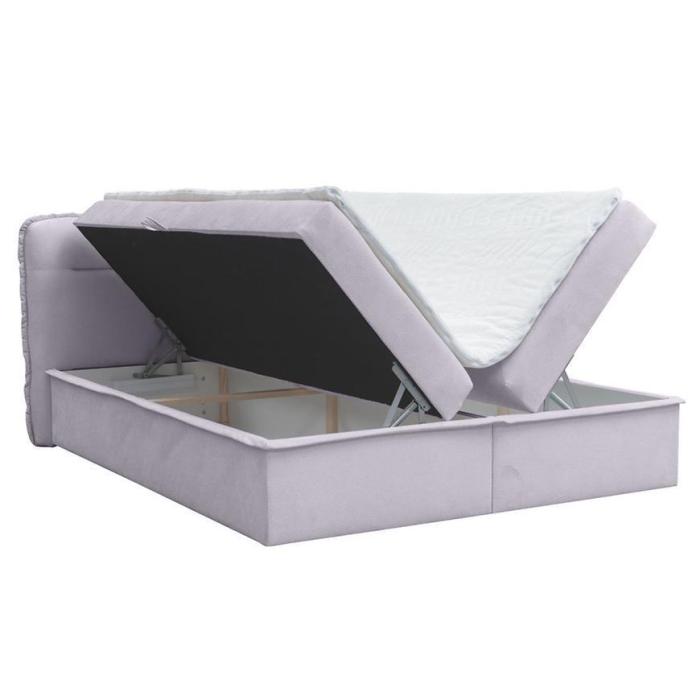 Łóżko Korfu to interesujący mebel dla osób ceniących sobie wygodę i atrakcyjny wygląd. Wyposażone zostało w dwa pojemniki na pościel, które otwierane są z boku za pomocą automatu na sprężynie. W komplecie dołączony jest stelaż oraz materac typu bonell z topperem visco