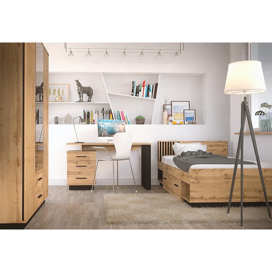 Kolorystyka i wybarwienie: Łóżko Lamelo łączy ciepły odcień dębu Wotan z eleganckim wykończeniem w czarnym macie. Ta harmonijna kombinacja kolorów nadaje wnętrzu nowoczesny i przytulny wygląd, idealnie komponując się z różnorodnymi aranżacjami.