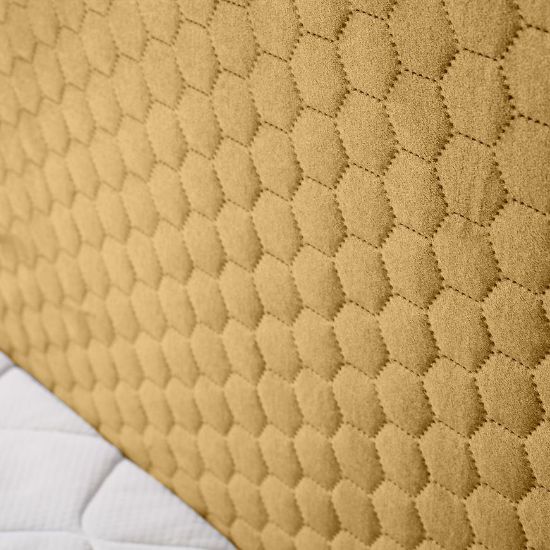 Jeśli chodzi o detale ozdobne, łóżko Lisa wyróżnia się pikowanym zagłówkiem w formie plastera miodu, co nadaje mu elegancji i nowoczesnego charakteru. Tył zagłówka został podbit czarną podbitką, co dodaje kontrastu i stylu.