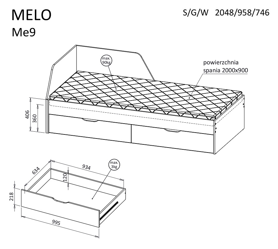 Dodatkowym atutem łóżka ME9 są dwie szuflady do przechowywania, umieszczone z prawej oraz lewej strony łóżka. To idealne rozwiązanie dla tych, którzy cenią sobie funkcjonalność i chcą maksymalnie wykorzystać dostępną przestrzeń. Maksymalne obciążenie jednej szuflady wynosi 3 kg, co pozwala na przechowywanie różnych przedmiotów, takich jak pościel, ubrania czy inne drobiazgi.