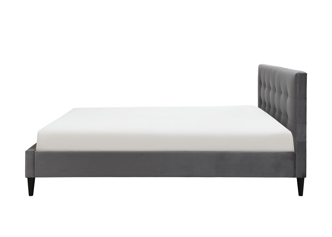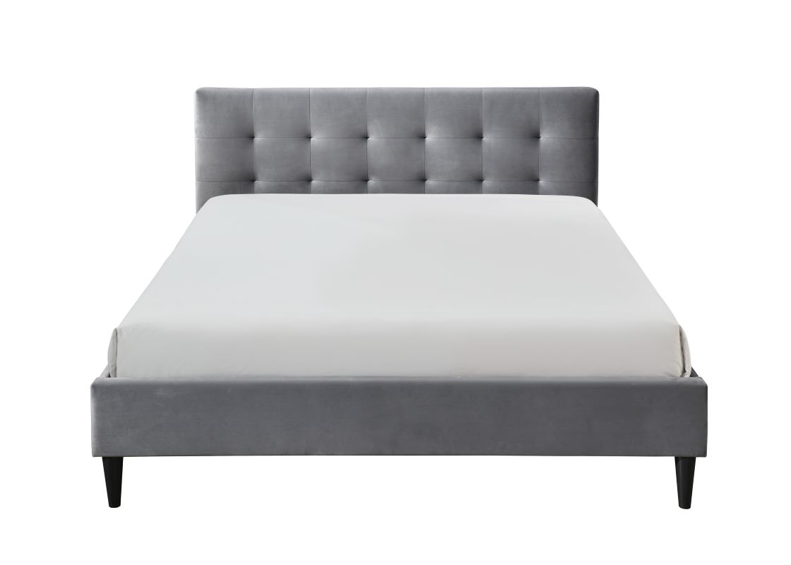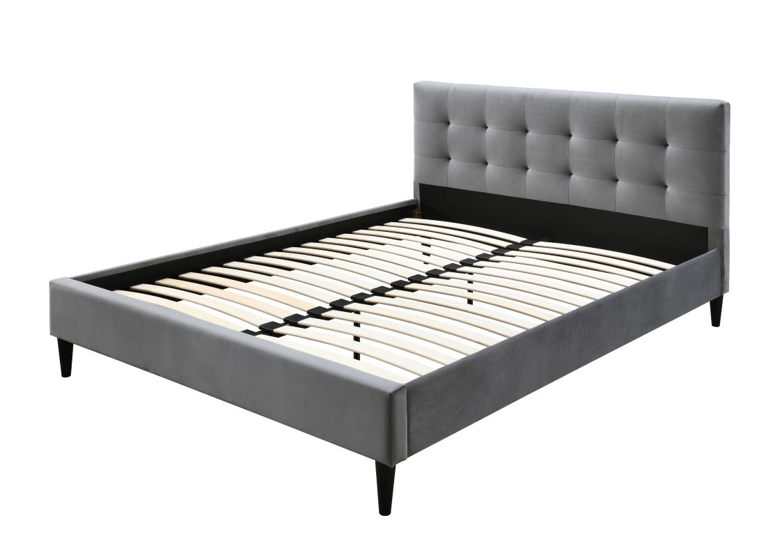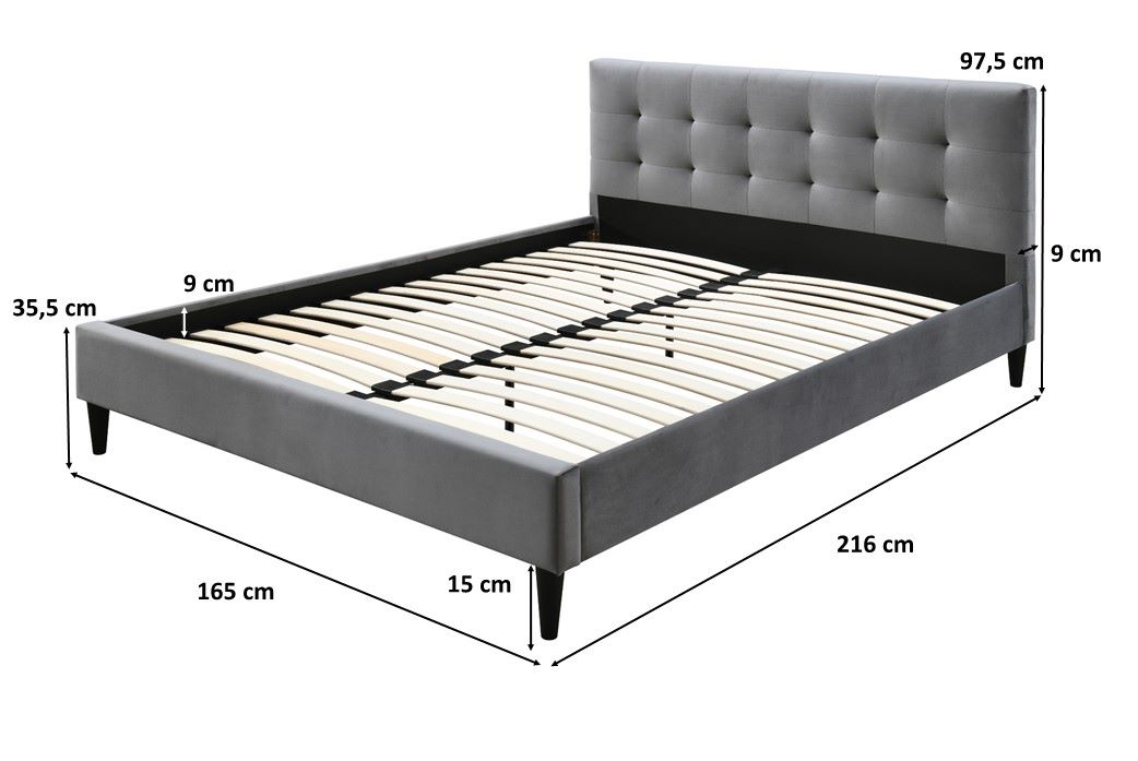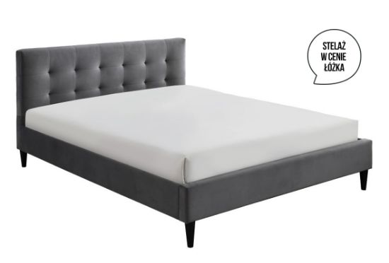 Łóżko Mezo 160 to łóżko tapicerowane tkaniną aksamitną w kolorze popielatym. Miękki zagłówek z pikowaniem, prosta forma oraz ergonomiczne kształty podkreślają wyjątkowe wzornictwo modelu. Konstrukcja łóżka Mezo jest wykonana z elementów płyty meblarskiej, płyty MDF oraz elementów litego drewna kauczukowego. W komplecie stelaż drewniany na metalowej ramie. Rama stelaża z dwiema nogami wspierającymi z regulacją wysokości. Listwy wykonane ze sklejki brzozowej. Powierzchnia spania o wymiarach 160x200 cm. Nóżki plastikowe w kolorze czarnym o wysokości 15 cm.