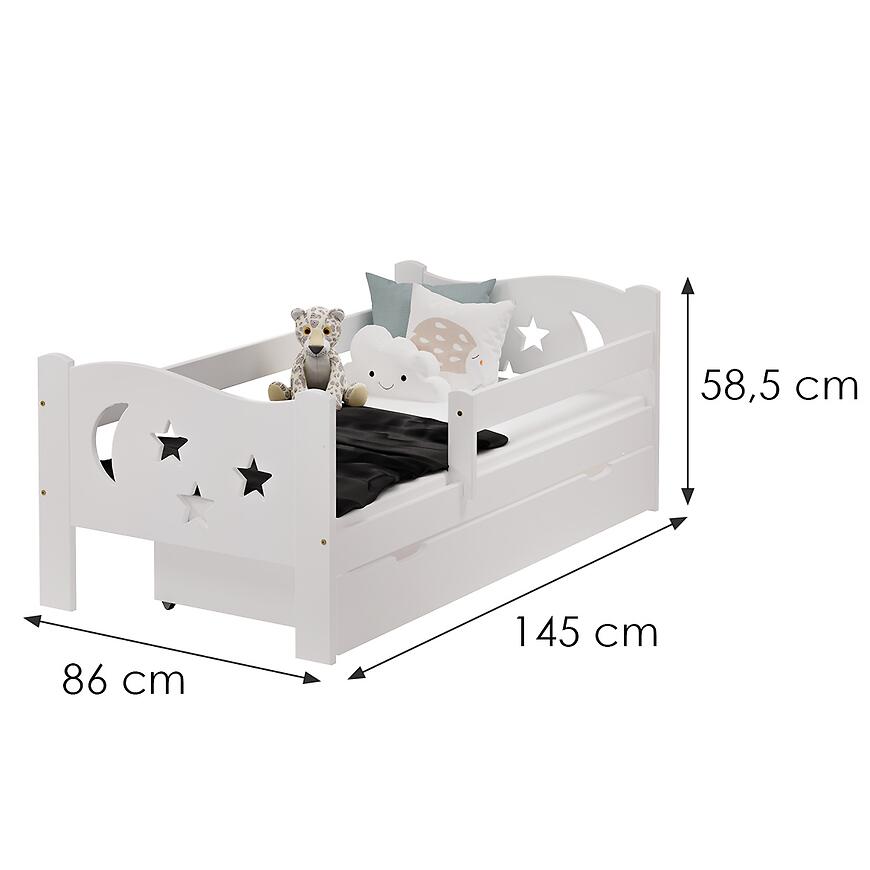 Łóżko posiada wymiary: szerokość 86 cm, głębokość 145 cm oraz wysokość 58,5 cm, co czyni je idealnym rozwiązaniem dla dzieci i młodzieży. Powierzchnia spania o wymiarach 80x140 cm zapewnia komfortowy, bezpieczny sen. W zestawie znajduje się stelaż dopasowany do materaca, który równomiernie podpiera ciało i zwiększa trwałość materaca.