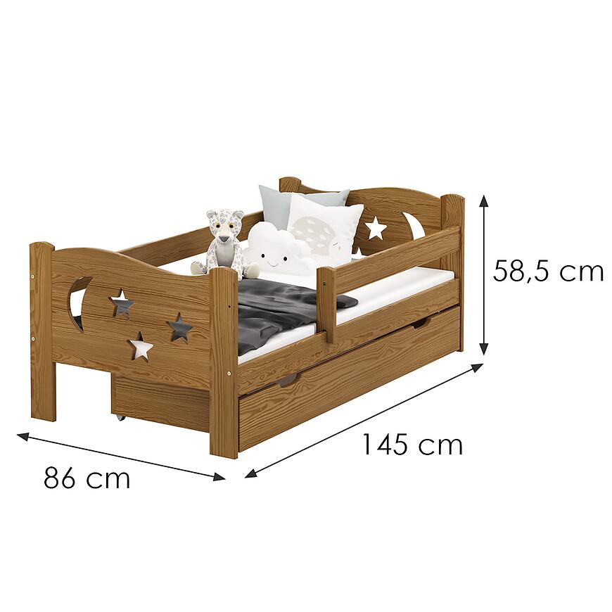 Łóżko posiada szerokość 86 cm, głębokość 145 cm i wysokość 58,5 cm. Powierzchnia spania 80x140 cm jest komfortowa dla dziecka, zapewniając wystarczającą przestrzeń do odpoczynku i snu.