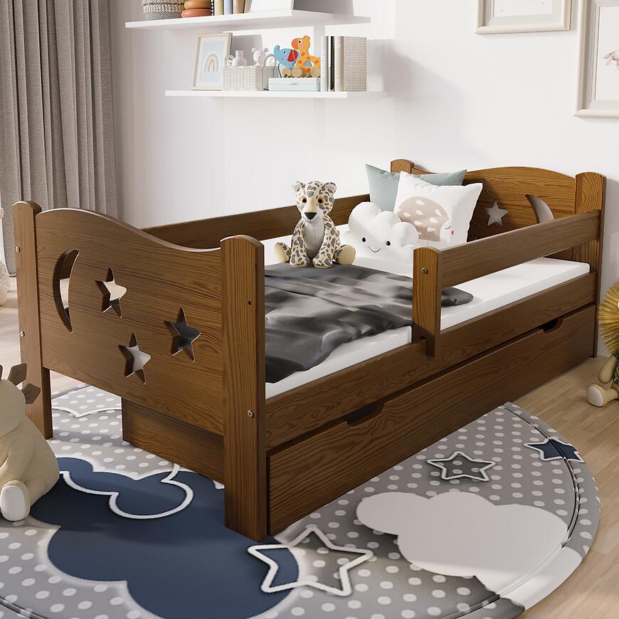 Łóżko Mikołaj 80/140 Dąb to klasyczny model dziecięcy wykonany z wysokiej jakości drewna, który łączy solidną konstrukcję z estetycznym, jasnym wybarwieniem dąb. Matowe wykończenie frontów i elementów drewnianych podkreśla naturalną strukturę drewna, nadając meblowi elegancki, przytulny charakter.