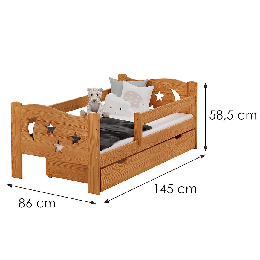 Łóżko posiada szerokość 86 cm, głębokość 145 cm oraz wysokość 58,5 cm. Powierzchnia spania 80x140 cm zapewnia dziecku wygodne i bezpieczne miejsce do odpoczynku. W zestawie znajduje się dopasowany stelaż, który równomiernie rozkłada ciężar ciała i zwiększa komfort spania oraz trwałość materaca.