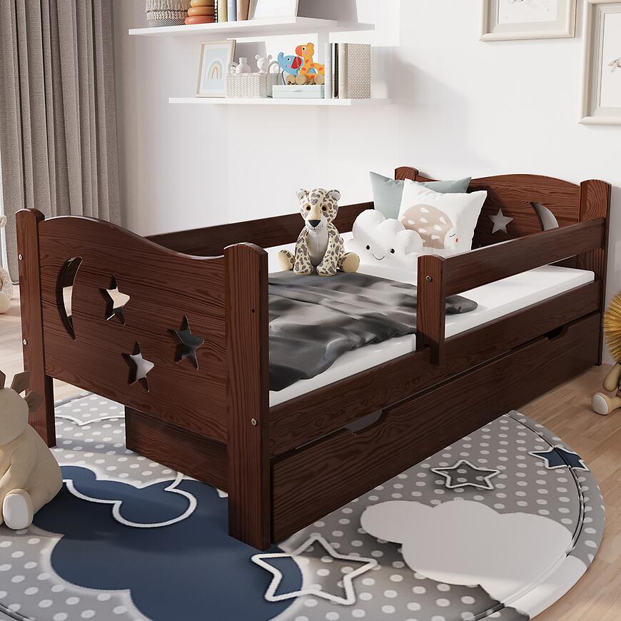 Łóżko Mikołaj 80/140 Orzech to drewniany mebel dziecięcy łączący klasyczny design z funkcjonalnością. Solidna konstrukcja, dołączony materac piankowy i stelaż w komplecie zapewniają wygodne i zdrowe miejsce do spania. Ciemne wybarwienie orzech w połączeniu z matowym wykończeniem nadaje pokojowi elegancki i przytulny charakter, a klasyczna forma mebla sprawia, że pasuje do większości dziecięcych aranżacji wnętrz.