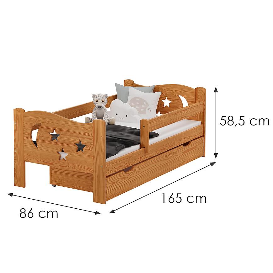 Łóżko Mikołaj 80/160 Olcha zostało wykonane z trwałego drewna, co gwarantuje stabilność i długowieczność mebla. Wymiary 86 cm szerokości, 165 cm głębokości i 58,5 cm wysokości sprawiają, że łóżko doskonale pasuje do standardowych i kompaktowych pokojów młodzieżowych. Stelaż o wymiarach 80x160 cm jest w komplecie, co pozwala na natychmiastowe korzystanie z łóżka.