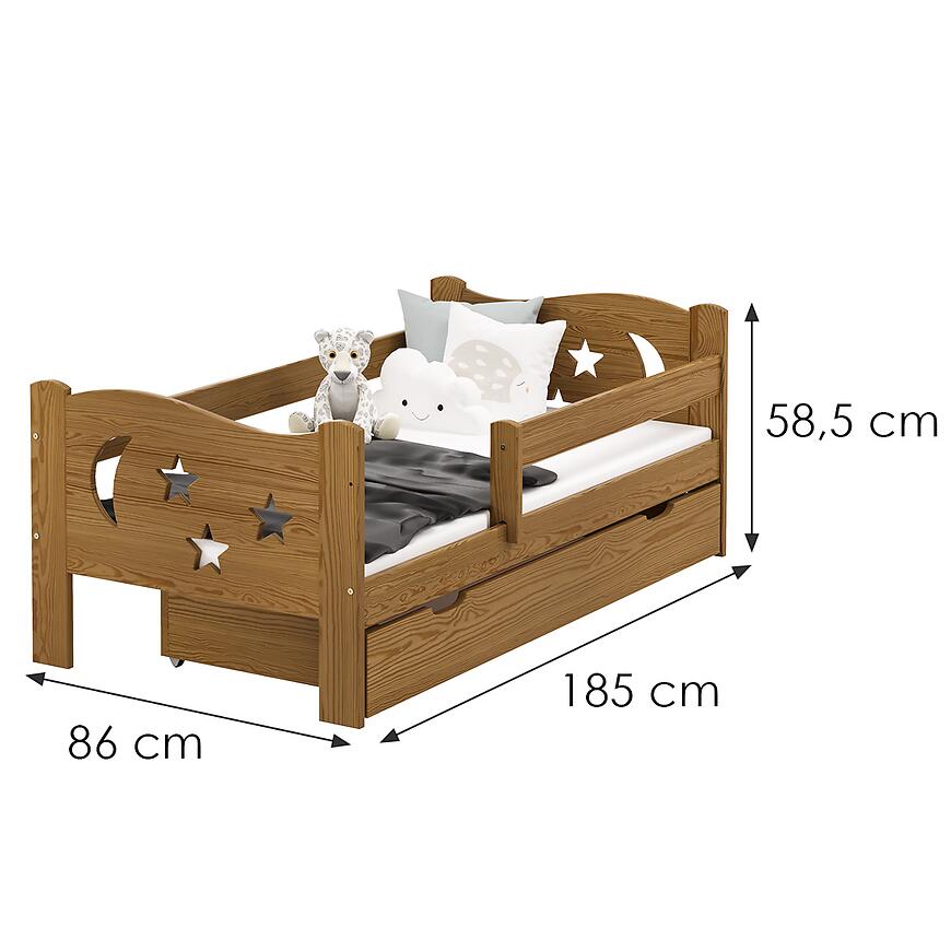 Konstrukcja łóżka została wykonana z wysokiej jakości drewna, co gwarantuje stabilność i wytrzymałość na lata. Dzięki wymiarom 86 cm szerokości, 185 cm głębokości i 58,5 cm wysokości, łóżko idealnie pasuje do standardowych pokoi młodzieżowych. Drewniany stelaż o wymiarach 80x180 cm jest w komplecie, co pozwala na szybkie i wygodne użytkowanie.