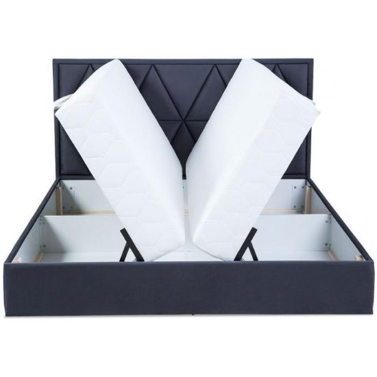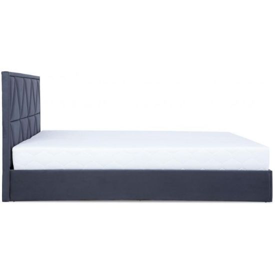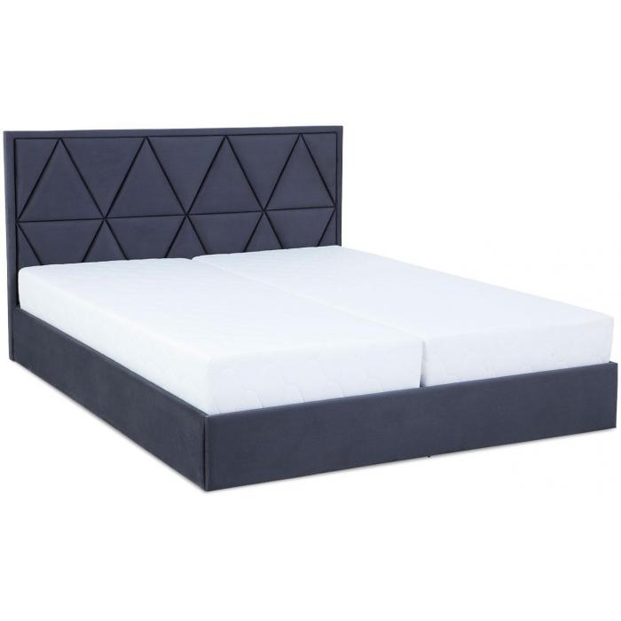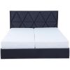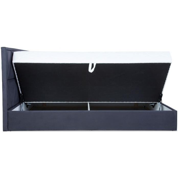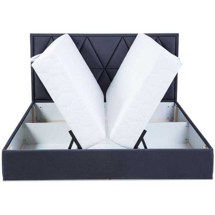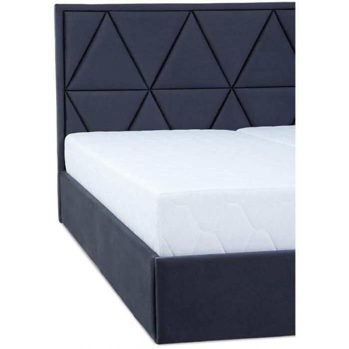 Łóżko Milos tapicerowane tkanina Manila 19 w kolorze grafitowym. Łóżko posiada dwa pojemniki na pościel. Do wyboru klienta dwa rodzaje zagłówków: typ A z ozdobnymi pikowaniami, typ B z pikowaniami karo. Łóżko Milos 160 wyposażone jest w materac z bonelem sprężynowym, tapicerowany bawełną w kolorze ecru. Powierzchnia spania wynosi 160x200 cm. Łóżko posiada automat wspomagający otwieranie.