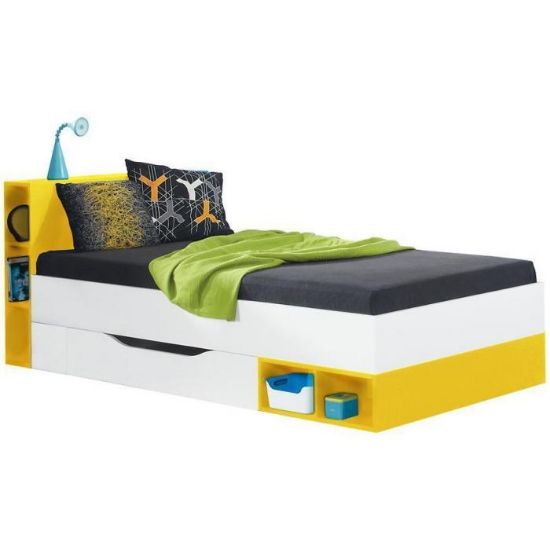 Łóżko Mobi dostępne w kolorze biały/żółty. W komplecie szuflada na pościel oraz stelaż. Łóżko posiada schowek na pościel, poduszki ,czy też koce. Dodatkowym atutem jest wysuwana szuflada. Powierzchnia spania wynosi 90x200 cm. Doskonale sprawdzi się w poku młodzieżowym. Łóżko do samodzielnego montażu.
