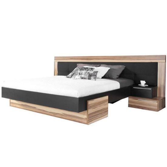 Mebel wykonany jest z płyty wiórowej laminowanej w kolorze czarny/orzech. Cena nie zawiera szafek nocnych. Łóżko nie posiada materaca w zestawie.