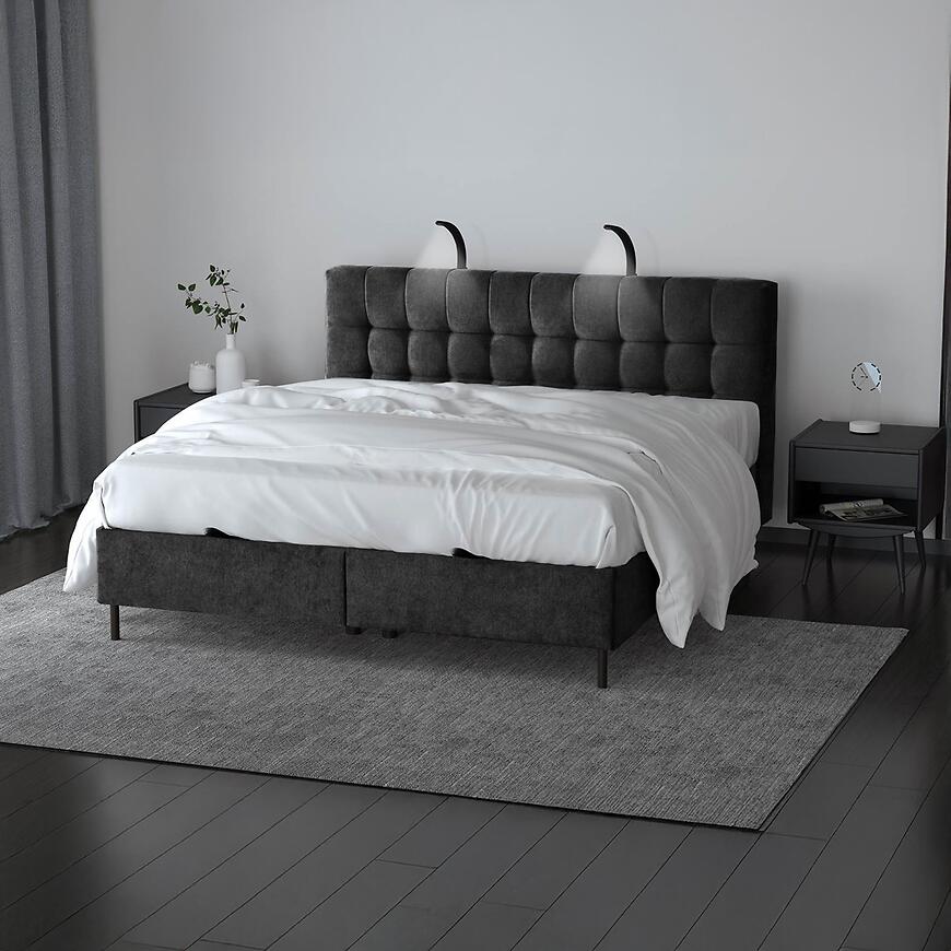 Nowoczesne łóżko Muna z topperem 180x200 Aston 18 to propozycja dla osób ceniących komfort i elegancję. W komplecie otrzymujesz stelaż, materac pocket oraz topper, co zapewnia zdrowy i wygodny sen. Praktyczne dwa pojemniki na pościel i wbudowane lampki sprawiają, że łóżko jest nie tylko piękne, ale i funkcjonalne. Stylowa czarna tapicerka z tkaniny oraz czarne nogi dodają całości wyrazistego charakteru, który doskonale uzupełni nowoczesną sypialnię. Dzięki funkcji spania i automatycznemu podnośnikowi łóżko łączy wygodę użytkowania z ponadczasowym stylem.