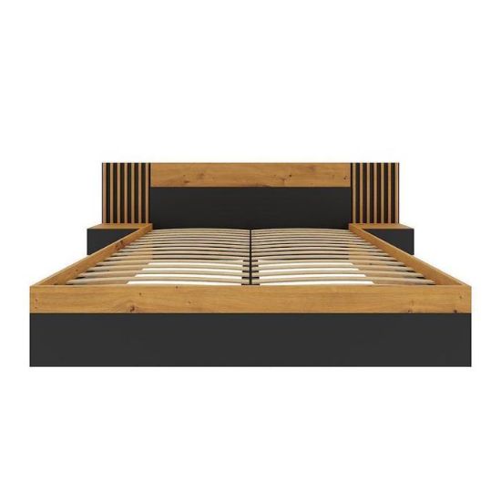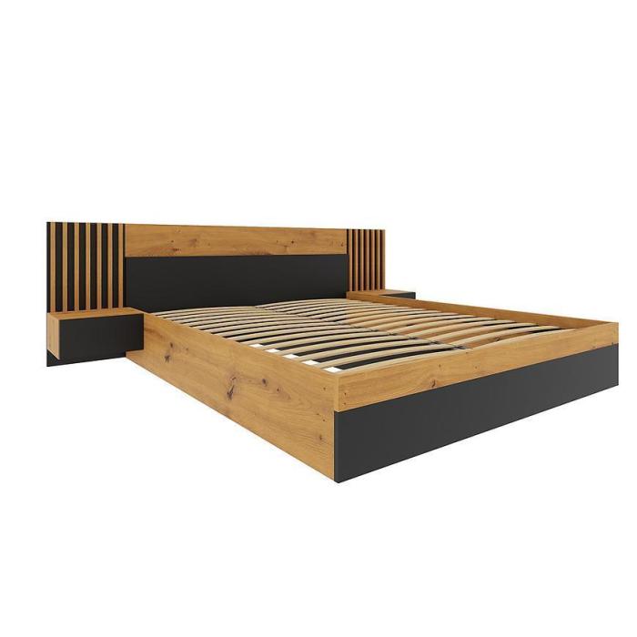 Dekor w odcieniu dąb artisan z elementami w czarnym kolorze nadaje meblom niezwykłego charakteru. To harmonijne połączenie naturalnego drewna z nowoczesnym akcentem, które dodaje sypialni wyjątkowego uroku.