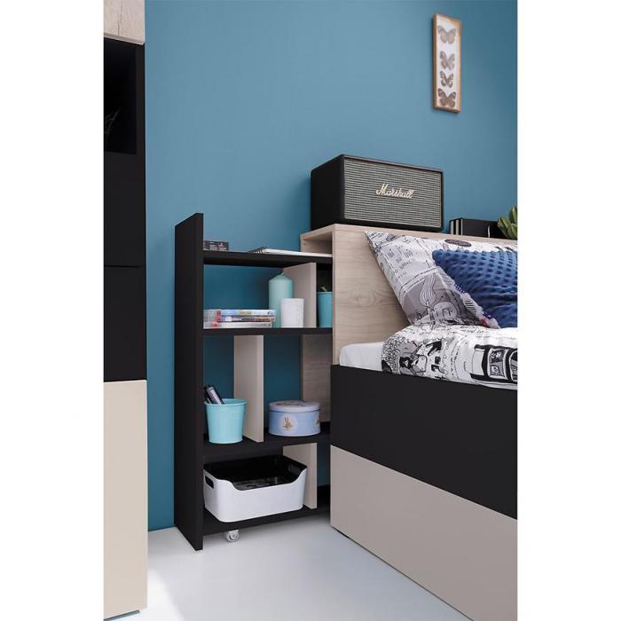 Łóżko Planet dostępne w kolorze czarny/dąb/beż. W komplecie szuflada na pościel oraz stelaż. Łóżko posiada schowek na pościel, poduszki czy też koce. Powierzchnia spania wynosi 90x200 cm. Stelaż jest w formie płyty z otworami wentylacyjnym. iDoskonale sprawdzi się w poku młodzieżowym. Łóżko do samodzielnego montażu.
