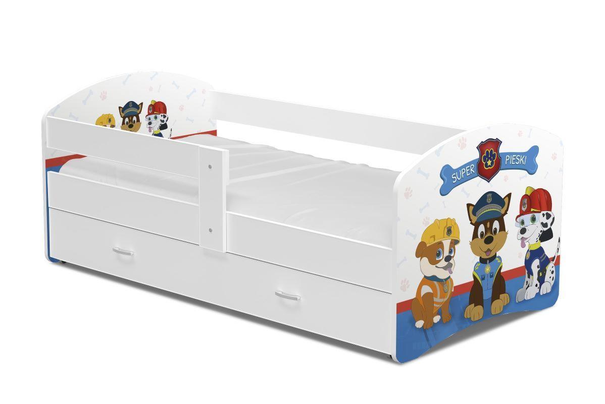Łóżko Rafi dostępne w sześciu wzorach kolorystycznych szczytu oraz korpusie w kolorze białym. Korpus wykonany został z płyty wiórowej obustronnie laminowanej, krawędzie boków zostały zabezpieczone za pomocą okleiny ABS. Kolorowy nadruk pokrytym laminatem odpornym na uszkodzenia.W zestawie stelaż łóżka typu FLEX materac piankowy i pojemnik na pościel. Łóżko do samodzielnego montażu.