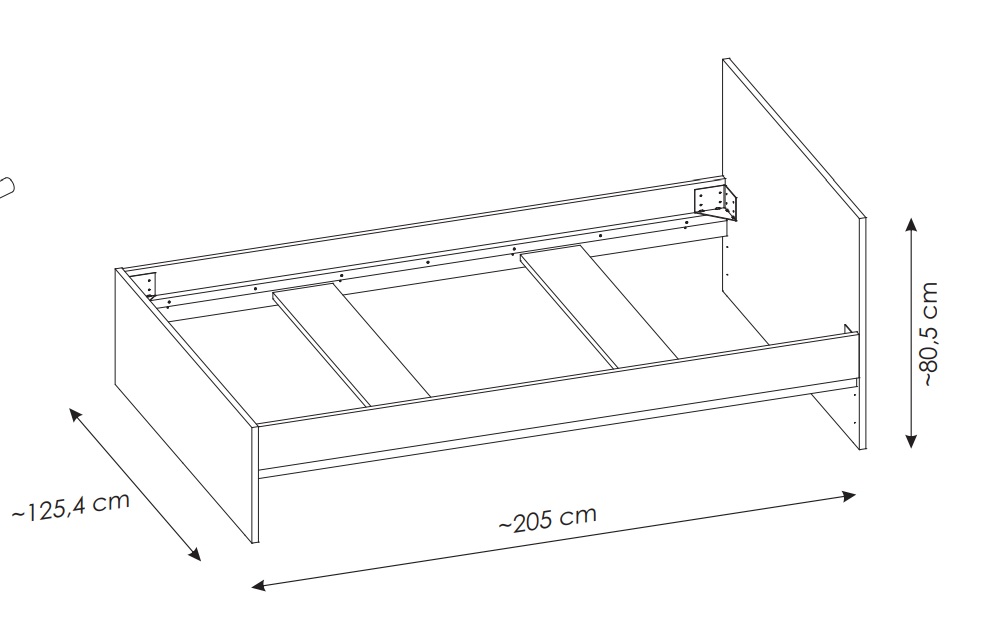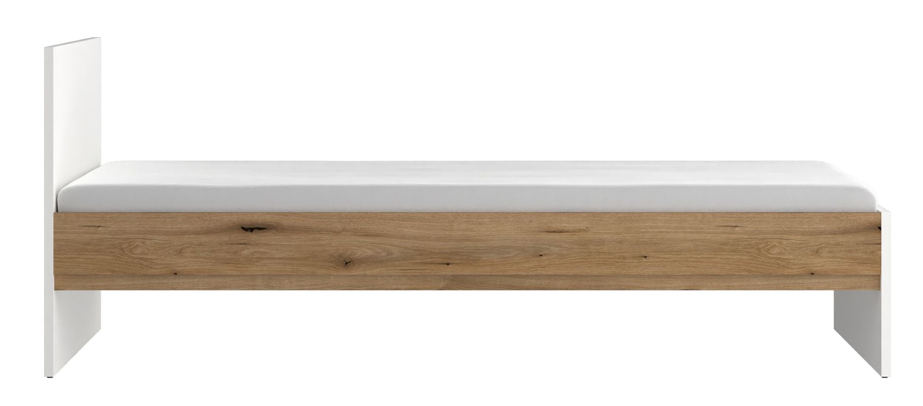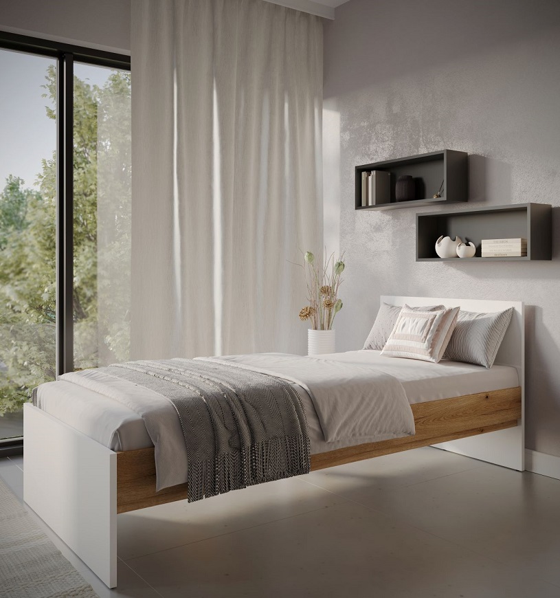 Boki oraz szczyty łóżka wykonano z laminowanej płyty wiórowej, co gwarantuje odporność na uszkodzenia mechaniczne oraz codzienne użytkowanie. Gładka powierzchnia jest łatwa w utrzymaniu w czystości, a precyzyjne wykończenie podkreśla nowoczesny charakter mebla.