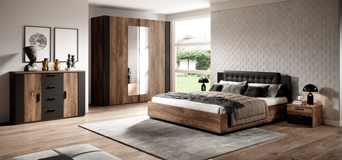 Łóżko to jeden z podstawowych elementów wyposażenia sypialni. Wytrzymały i solidny moduł posiada ciekawą konstrukcje i idealnie wpisze się w styl nowoczesny. Ze względu na wybarwienie będzie pasować do współczesnych i śmiałych aranżacji. Ozdobny, częściowo tapicerowany zagłówek nada wnętrzu oryginalnego wyglądu.
