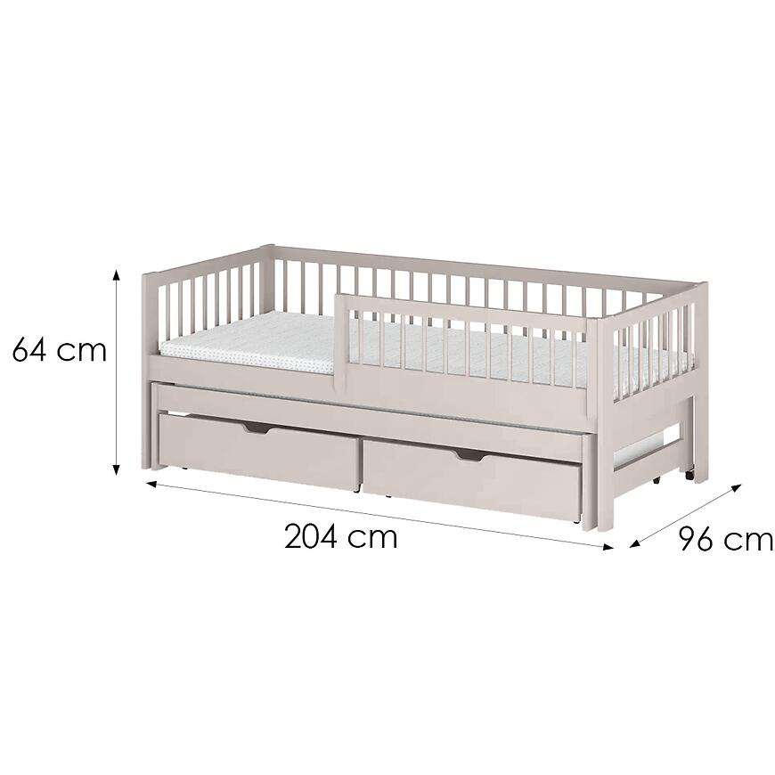 Model Softi posiada dwa pojemniki na pościel, które umożliwiają wygodne przechowywanie kołder, poduszek i innych tekstyliów. Dzięki temu łóżko łączy funkcjonalność z estetyką, pomagając utrzymać porządek. Wysokość całkowita wynosi 64 cm, a wymiary łóżka – szerokość 96 cm i głębokość 204 cm – gwarantują komfort użytkowania bez zajmowania nadmiernie dużo miejsca w pomieszczeniu.