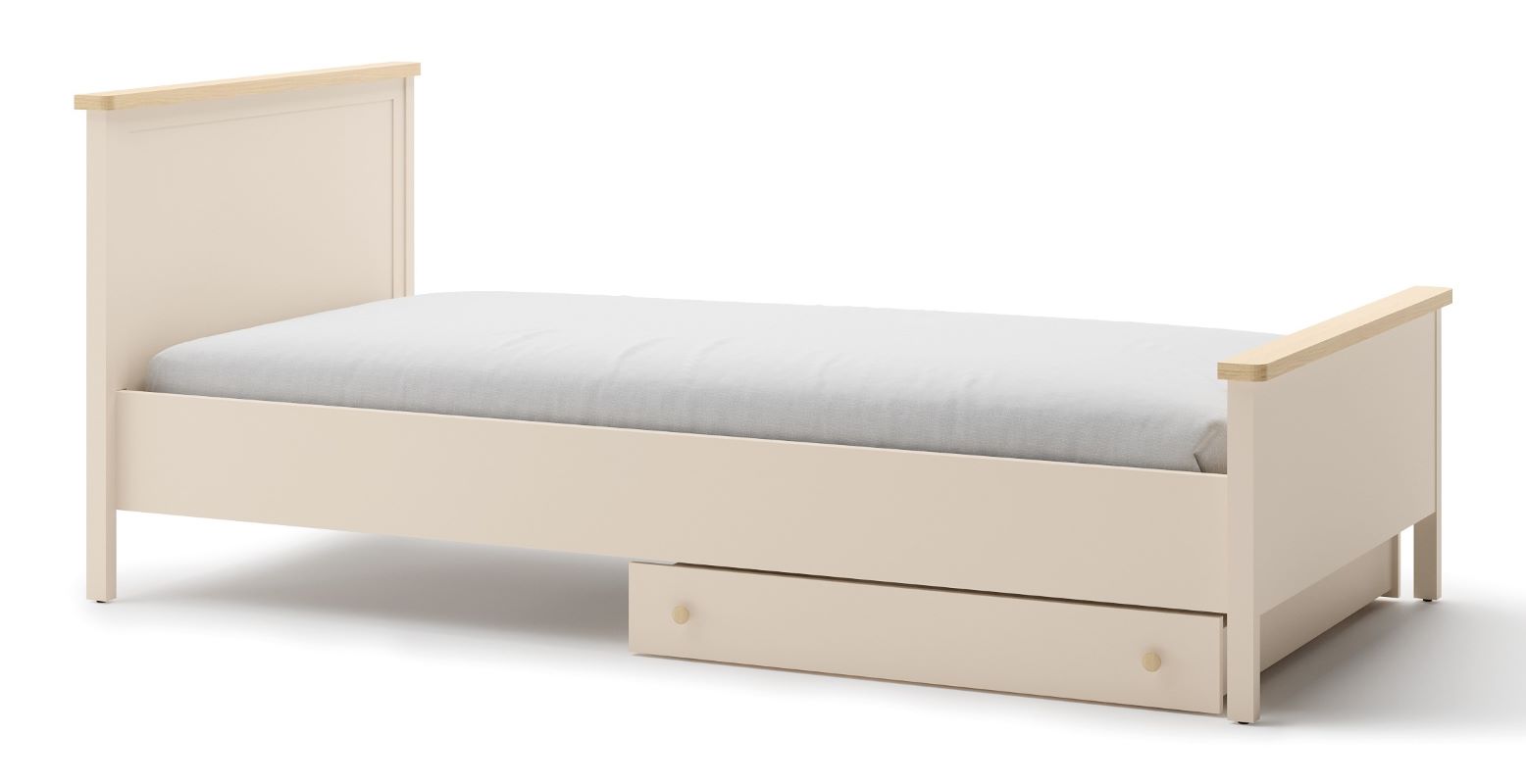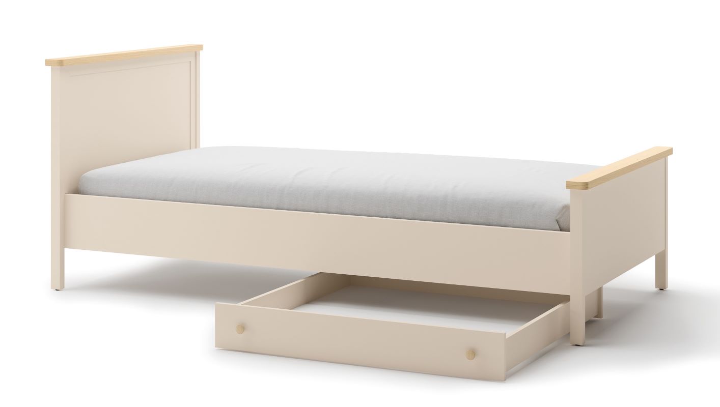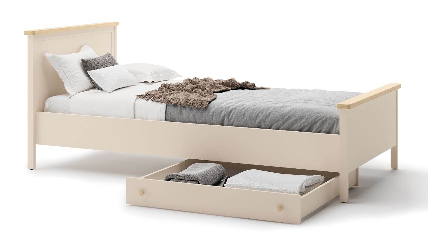 Łóżka z kolekcji Story można rozbudować o jedną lub dwie szuflady na pościel, które świetnie sprawdzą się również jako miejsce na sezonowe koce, walizki czy drobiazgi.