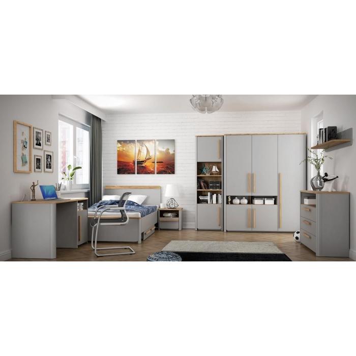 Kolekcja mebli młodzieżowych Surfinio to kompleksowa odpowiedź na potrzeby nastolatków. Odznacza się intersującym lecz prostym designem. Chłodny kolor szarości połączony został z kolorem dąb catania, dzięki temu pokój nabiera przytulności. Pojemna szafa i komoda z szufladami pomieszczę potrzebne rzeczy oraz pozwolą na utrzymanie porządku. System posiada duże wygodne uchwyty które są również elementem ozdobnym. W skład systemu Surfinio wchodzą: biurko, komoda z szufladami, regał, duża szafa ubraniowa, szafka nocna, półka wisząca oraz łóżko do którego można dodatkowo zakupić pojemną szufladę na pościel.