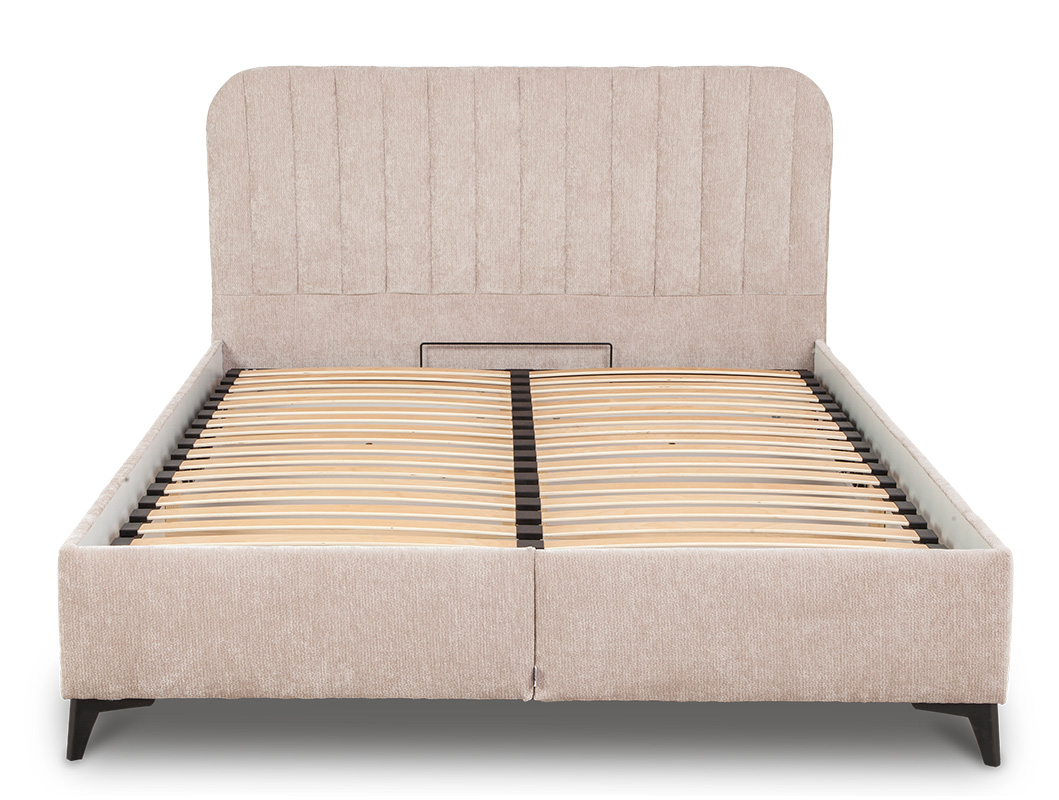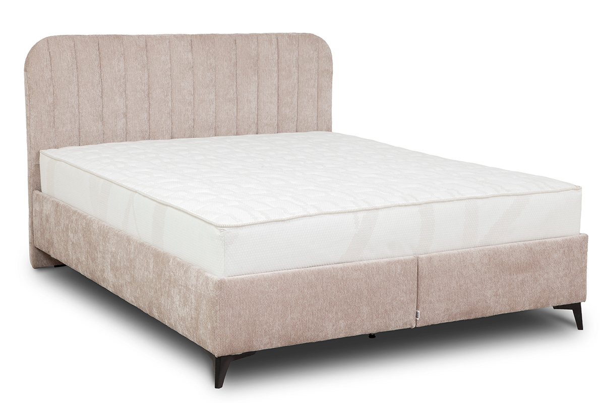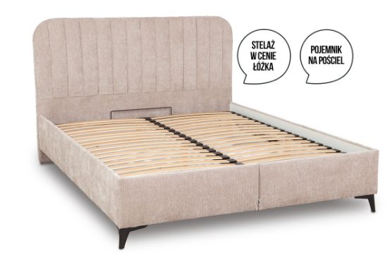 Tapicerka wykonana została z tkaniny Vibe w beżowym odcieniu. Materiał jest przyjemny w dotyku, a jednocześnie odporny na ścieranie, co ma znaczenie w codziennym użytkowaniu. Neutralny kolor ułatwia dopasowanie łóżka do różnych aranżacji – od jasnych, minimalistycznych wnętrz po bardziej klasyczne sypialnie z drewnianymi akcentami.