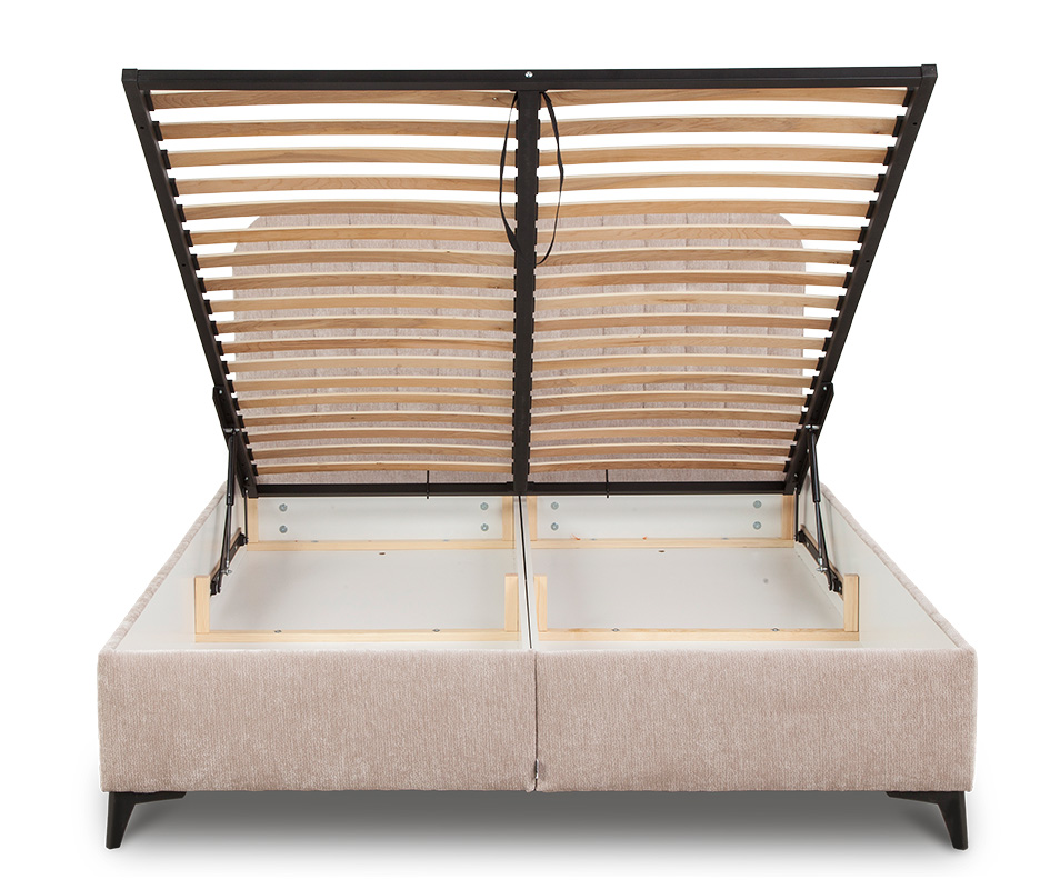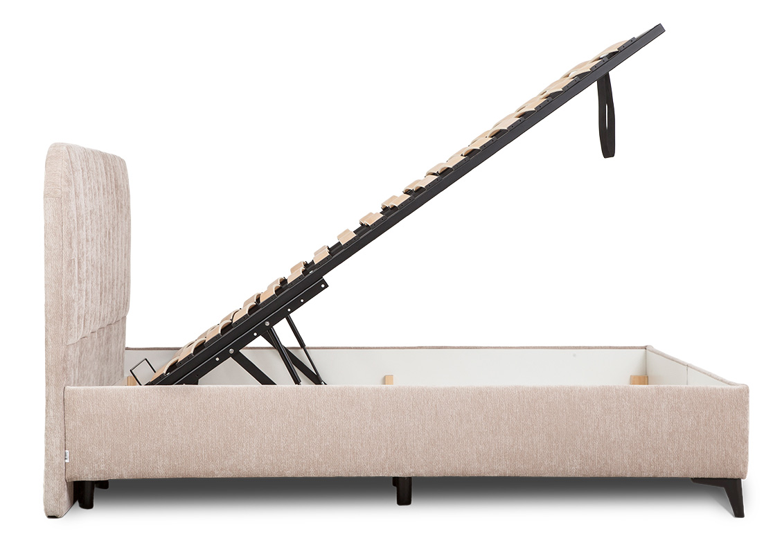 Łóżko Leo posiada pojemnik na pościel umieszczony pod całą powierzchnią stelaża. Dostęp do schowka uzyskuje się poprzez podniesienie ramy przy użyciu podnośników i siłowników gazowych. Mechanizm działa płynnie i nie wymaga dużej siły, dlatego sprawdzi się także przy częstym otwieraniu.